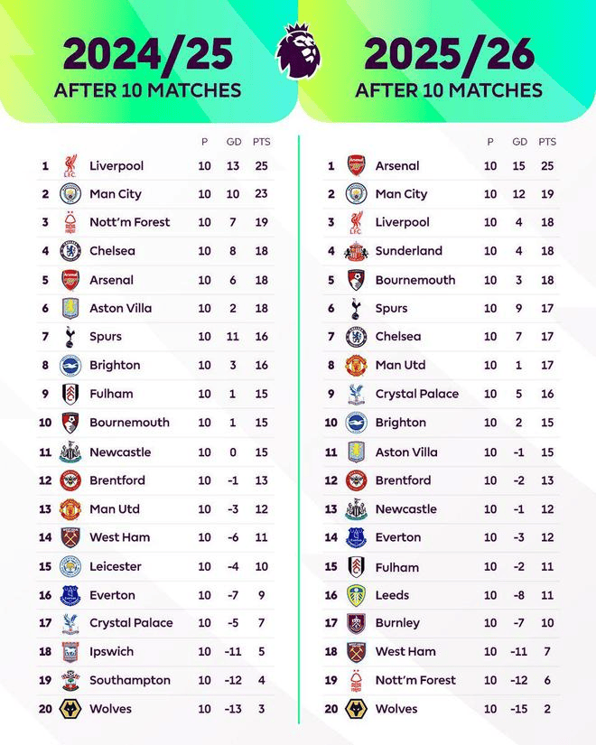 หลังจากผ่านไป 10 นัดในพรีเมียร์ลีกฤดูกาลนี้ แมนเชสเตอร์ ยูไนเต็ด อยู่ในอันดับที่ 8 ของตาราง มี 17 คะแนน จาก 5 ชัยชนะ 2 เสมอ และ 3 แพ้ อย่างไรก็ตาม พวกเขายังตามหลังทีมอันดับ 4 เพียง 1 คะแนน เมื่อเทียบกับ 12 คะแนนในระยะเดียวกันของฤดูกาลที่แล้ว นี่ถือเป็นการปรับปรุงที่ชัดเจนเพียง 5 คะแนนเท่านั้น