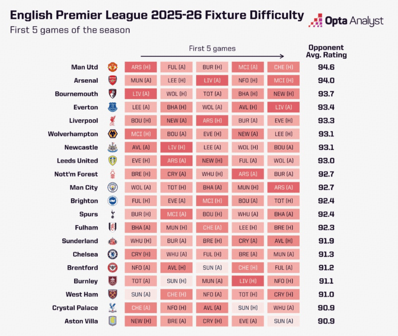 ตามข้อมูลอย่างเป็นทางการจาก OPTA ผู้ให้บริการข้อมูลพรีเมียร์ลีก แมนเชสเตอร์ ยูไนเต็ด ต้องเผชิญกับคู่แข่งที่มีค่าสัมประสิทธิ์ความยากลำบากอยู่ที่ 94.6 ในห้าเกมแรกของฤดูกาลใหม่ ซึ่งเป็นค่าสูงสุดในบรรดาทุกสโมสร ค่าสัมประสิทธิ์ความยากลำบากสำหรับสิบเกมแรกของพวกเขาอยู่ที่ 93.2 ซึ่งอยู่ในอันดับที่สามของลีก