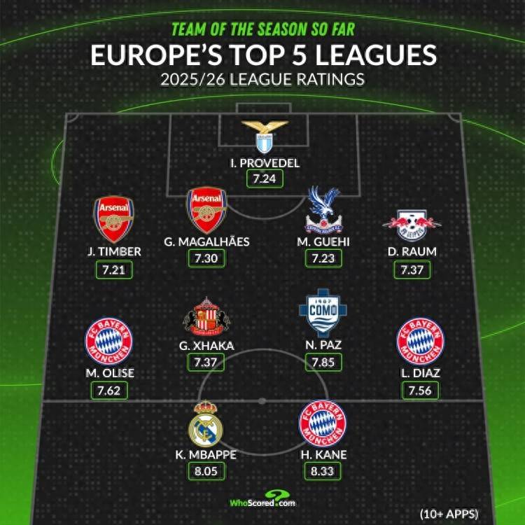 - 四中场:迪亚斯/拜仁、尼科-帕斯/科莫、扎卡/桑德兰、奥利塞/拜仁