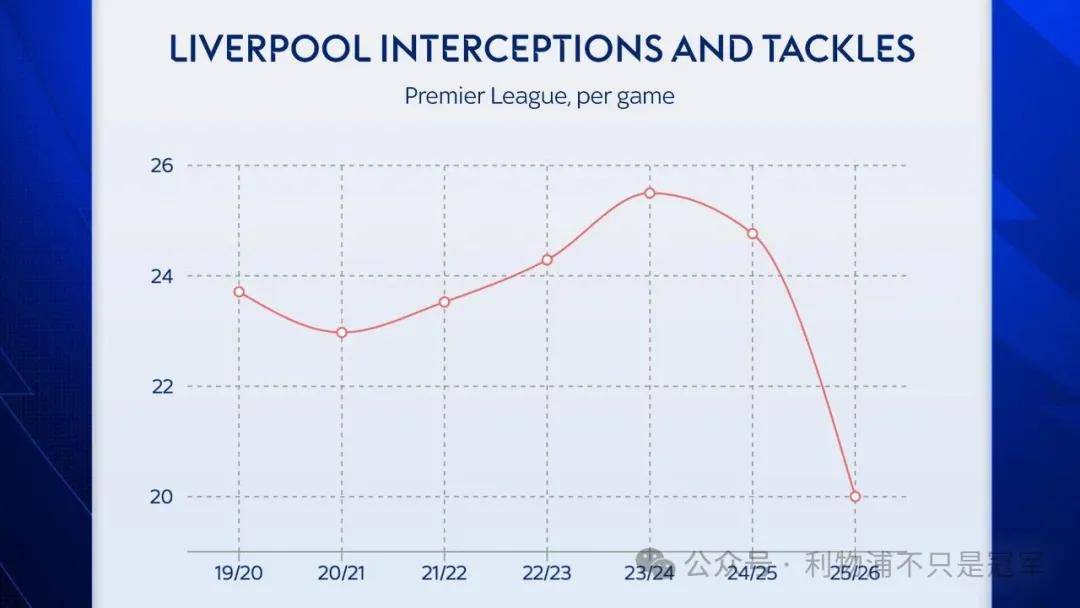 เมื่อหันมาดูการกดดันสูง ความถี่ในการกดดันของลิเวอร์พูลในฤดูกาลที่แล้วสูงกว่าห้าฤดูกาลก่อนหน้า แต่ในฤดูกาลนี้กลับลดลงสู่ระดับต่ำสุดในรอบเจ็ดฤดูกาลที่ผ่านมา
