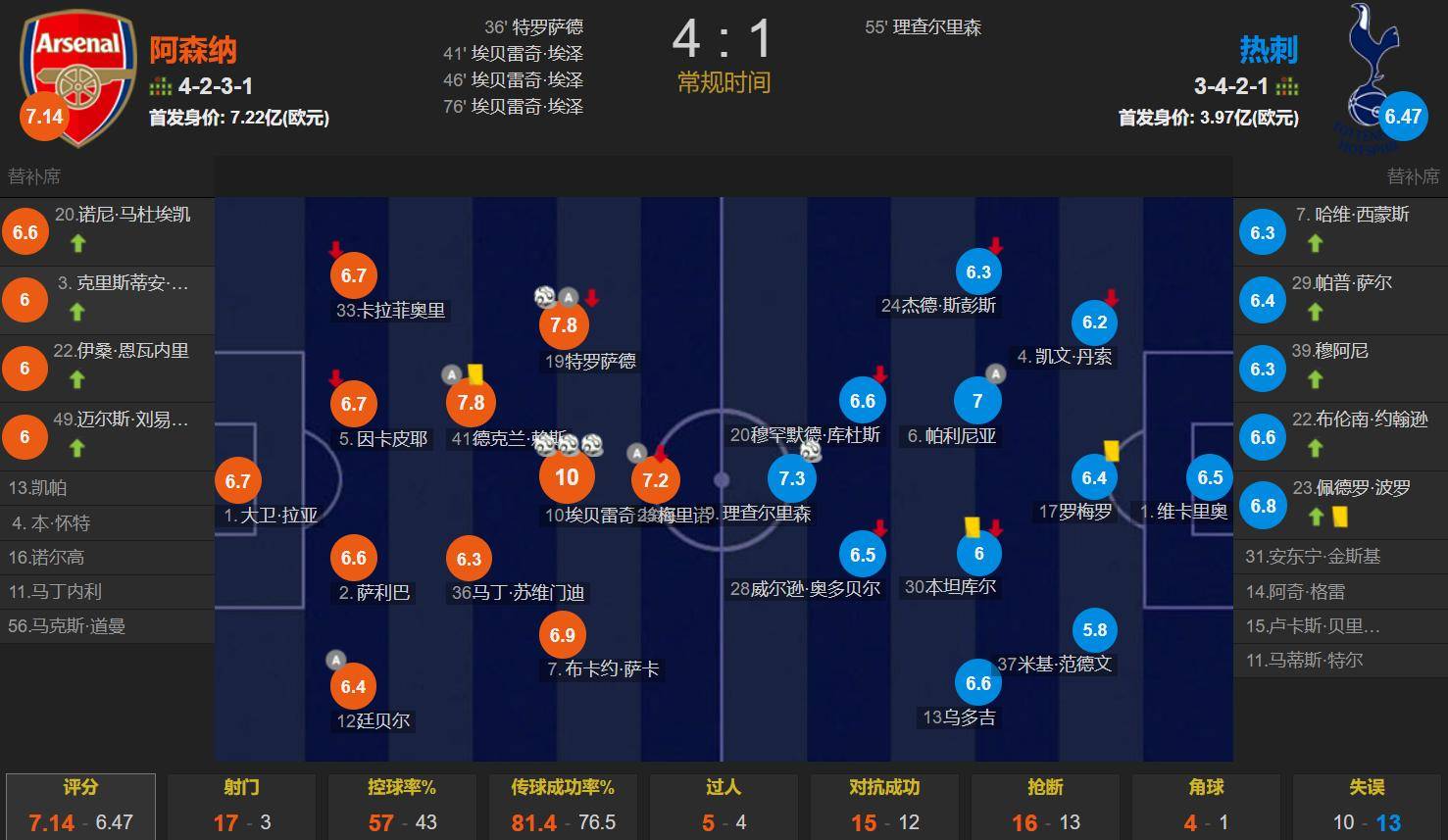ในที่สุด อาร์เซนอลถล่มท็อตแน่ม 4-1 ขยายสถิติไร้พ่ายเป็น 9 นัดในลีกและ 15 นัดในทุกรายการ ขณะนี้พวกเขานำเป็นจ่าฝูงในตารางพรีเมียร์ลีกด้วยคะแนนนำ 6 แต้ม ส่วนท็อตแน่มที่ยังไม่ชนะใน 3 นัดล่าสุด อยู่อันดับที่ 9