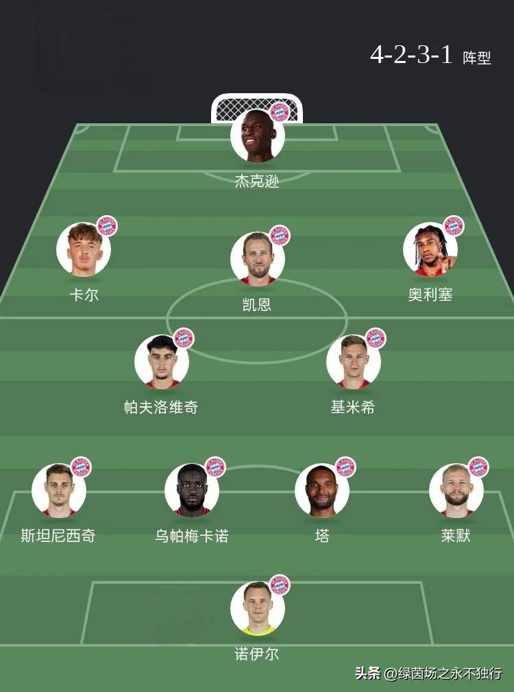 阿森纳的主要替补包括马丁内利、马杜埃凯、恩瓦内里、道曼、内尔高、斯凯利、莫斯克拉以及本-怀特等人。拜仁方面,伤病问题更为严重,格纳布里、穆西亚拉、阿方索-戴维斯缺阵,路易斯-迪亚斯则因红牌停赛无法出场。这对拜仁的边路突破和中场组织造成较大影响。预计拜仁将安排凯恩出任前腰,雅克松担任中锋,首发阵型同样为4231。