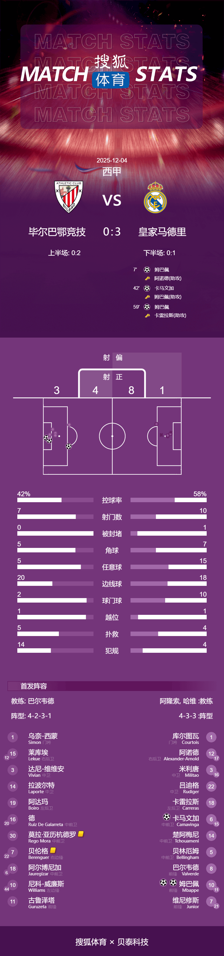 เวลา 02:00 น. ตามเวลาปักกิ่ง วันที่ 4 ธันวาคม การแข่งขันลาลีกาฤดูกาล 2025-2026 นัดที่ 19 มีการแข่งขันที่น่าจับตามองเมื่อเรอัล มาดริด เดินทางไปพบกับแอธเลติก บิลเบา ในครึ่งแรก อาร์โนลด์จ่ายบอลให้เอ็มบัปเป้ทำประตูหลังจากวิ่งเดี่ยว จากนั้นอาร์โนลด์ก็เปิดบอลให้เอ็มบัปเป้โหม่งต่อให้กามาวินก้าโหม่งเข้าประตูไปไม่นานหลังจากเริ่มเกมใหม่ อาร์โนลด์ต้องออกจากสนามเนื่องจากอาการบาดเจ็บ จากนั้น คาร์ราสส์ช่วยเอ็มบัปเป้ทำประตูจากระยะไกล ขณะที่คามาวินก้าก็ถูกเปลี่ยนตัวออกเนื่องจากอาการบาดเจ็บในช่วงท้ายเกม ในที่สุด เรอัล มาดริด ก็เอาชนะแอธเลติก บิลเบา 3-0 ในเกมเยือน ทำให้พวกเขาหยุดสถิติเสมอในลาลีกา 3 นัดติดต่อกัน และเข้าใกล้บาร์เซโลน่ามากขึ้น โดยตามหลังจ่าฝูงเพียง 1 แต้มเท่านั้น