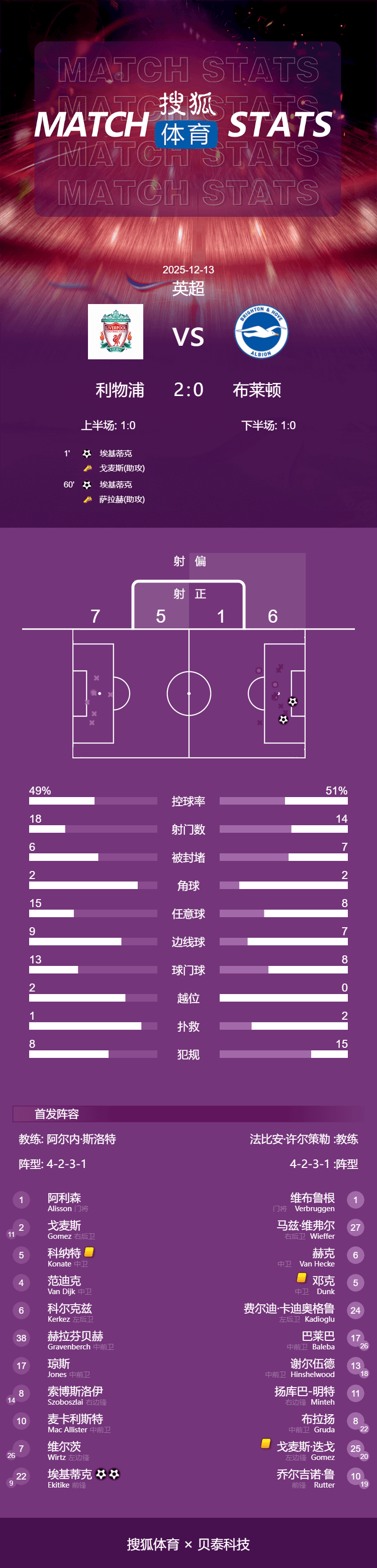 เวลา 23:00 น. ตามเวลาปักกิ่ง วันที่ 13 ธันวาคม การแข่งขันพรีเมียร์ลีกฤดูกาล 2025-26 รอบที่ 16 ยังคงดำเนินต่อไป โดยแชมป์เก่าอย่างลิเวอร์พูลสามารถเอาชนะไบรท์ตันได้ 2-0 ที่สนามแอนฟิลด์ ผลการแข่งขันนี้ทำให้พวกเขาหยุดสถิติเสมอในลีกสองนัดติดต่อกัน และขยายสถิติไม่แพ้ใครเป็นสี่นัดติดต่อกัน รวมถึงเป็นการชนะในลีกสองนัดติดต่อกันเป็นครั้งแรกในฤดูกาลนี้เอกิตีทำประตูแรกได้หลังจากเริ่มเกมเพียง 46 วินาที ก่อนจะทำประตูที่สองในนาทีที่ 60 จากลูกเตะมุมของซาลาห์ นอกจากนี้ ดิเอโก โกเมซ ยังยิงชนเสาจากระยะเผาขนอีกด้วย