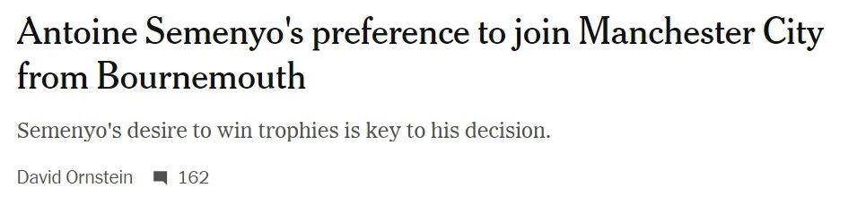 เรื่องราวการย้ายทีมของ Antoine Saïmonyo ได้สิ้นสุดลงแล้ว โดยนักข่าวชื่อดัง David Ornstein จาก "El Mundo Deportivo" รายงานว่า Saïmonyo ได้แจ้งทั้งแมนเชสเตอร์ ยูไนเต็ด และแมนเชสเตอร์ ซิตี้ ถึงความต้องการที่จะย้ายไปร่วมทีมซิตี้ในช่วงตลาดซื้อขายนักเตะเดือนมกราคม ความปรารถนาที่จะคว้าแชมป์เป็นปัจจัยสำคัญที่ทำให้ Saïmonyo เลือกทีมของ Pep Guardiola นับตั้งแต่ปี 2018 ทีมของ Guardiola ได้คว้าแชมป์พรีเมียร์ลีกถึงหกครั้ง