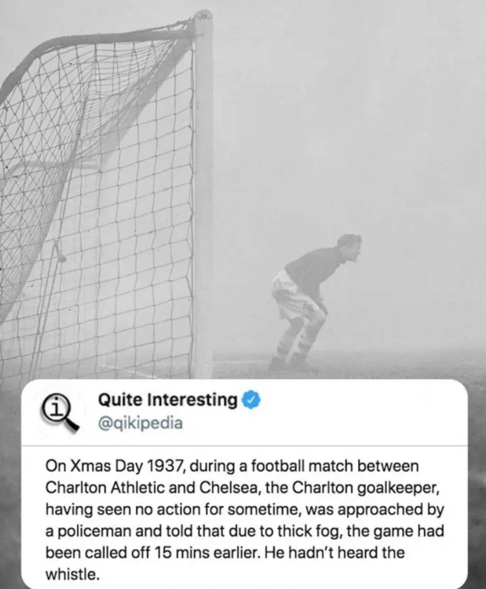 ในวันคริสต์มาสปี 1937 มีการแข่งขันฟุตบอลดิวิชั่นหนึ่งระหว่างทีมชาร์ลตันกับทีมเชลซีเป็นเจ้าบ้าน ณ สนามสแตมฟอร์ดบริดจ์ อย่างไรก็ตาม สภาพอากาศเลวร้ายมากจนสนามถูกปกคลุมด้วยหมอกหนาทึบ ในครึ่งหลัง ความสามารถในการมองเห็นแย่ลงจนไม่สามารถแข่งขันต่อไปได้ ผู้ตัดสินจึงต้องยกเลิกการแข่งขันณ จุดนี้ เบอร์แทรม ผู้รักษาประตูของชาร์ลตัน ยังคงไม่รู้เรื่องสถานการณ์ในสนามเลย ขณะที่ผู้เล่นคนอื่น ๆ ได้ออกจากสนามไปแล้ว เบอร์แทรมยังคงยืนเฝ้าประตูอย่างมั่นคง เชื่อมั่นว่าเกมยังดำเนินอยู่ เขามองตรงไปข้างหน้าอย่างตั้งใจ เตรียมพร้อมที่จะเซฟลูกได้ทุกเมื่อ กลัวว่าอาจจะมีลูกยิงไกลที่ไม่คาดคิดพุ่งเข้ามาหาเขาอย่างกะทันหัน