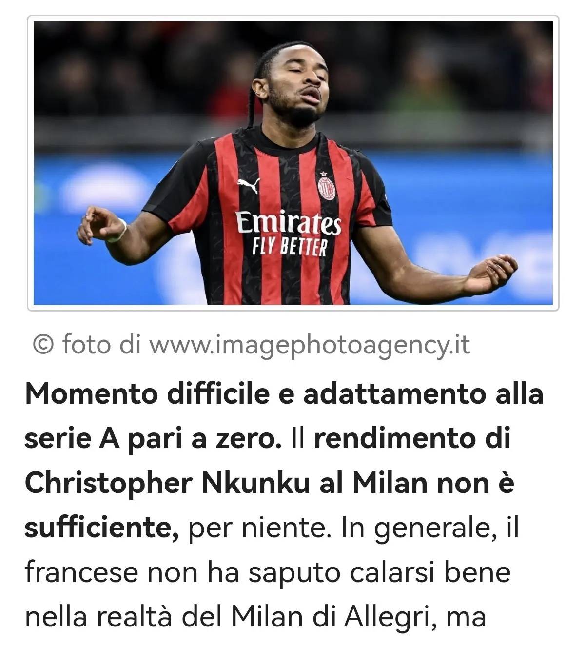 เมื่อพบว่าตัวเองอยู่ในสถานการณ์ที่ยากลำบาก การปรับตัวของเขาในเซเรียอาแทบจะไม่มีอยู่เลย ผลงานของคริสโตเฟอร์ เอ็นคุนคูกับมิลานนั้นห่างไกลจากความเพียงพออย่างมาก ไม่เพียงพออย่างสิ้นเชิง โดยรวมแล้ว นักเตะชาวฝรั่งเศสไม่สามารถปรับตัวเข้ากับระบบของมิลานภายใต้การคุมทีมของอัลเลกรีได้อย่างมีประสิทธิภาพ แม้ว่าจะต้องยอมรับว่านี่ไม่ใช่ความผิดของเขาเพียงฝ่ายเดียว