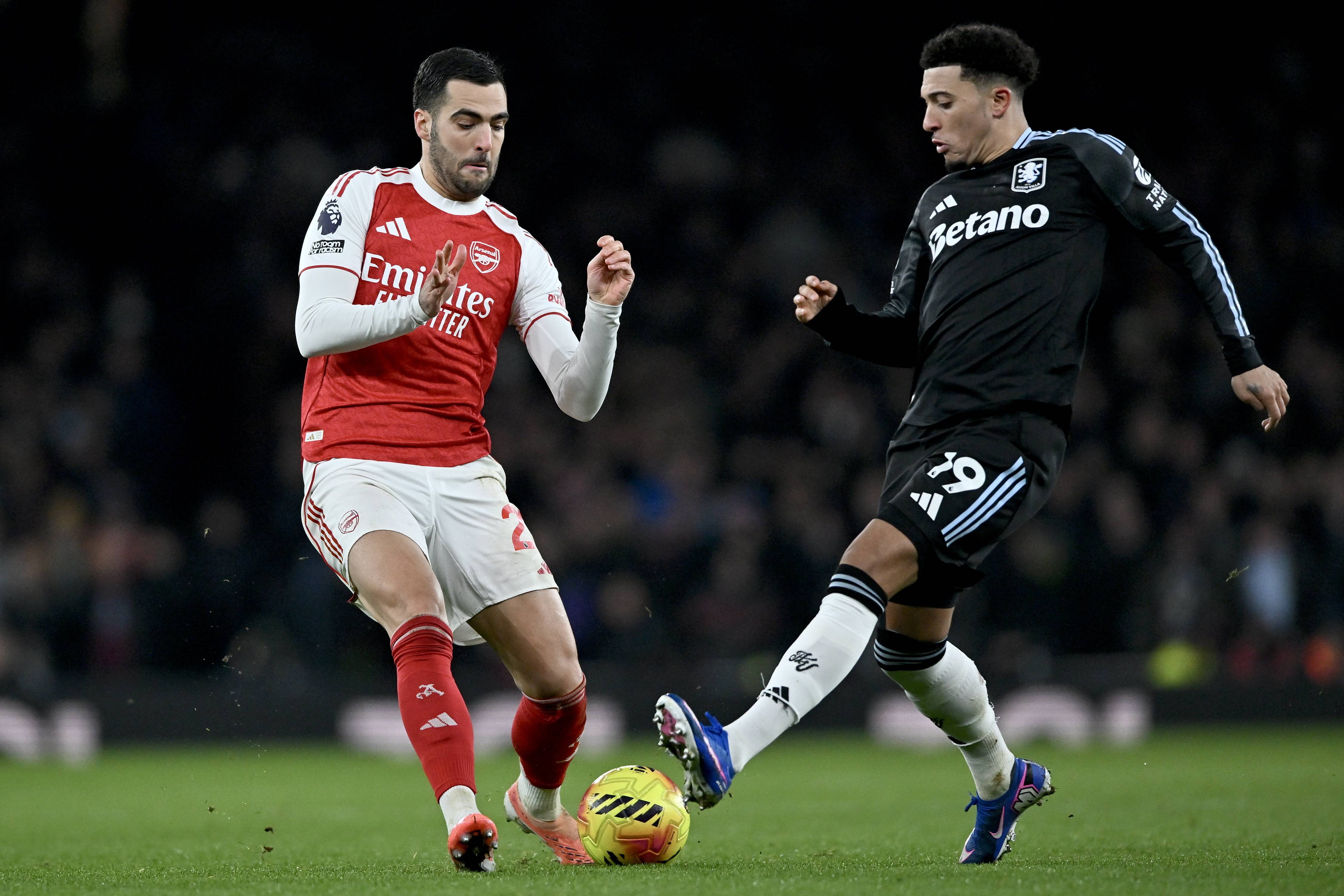 เมื่อวันที่ 30 ธันวาคม เมเรโน่ของอาร์เซนอล (ซ้าย) เข้าปะทะกับซานโช่ของแอสตัน วิลล่าเพื่อแย่งบอล ซินหัว/EPA
