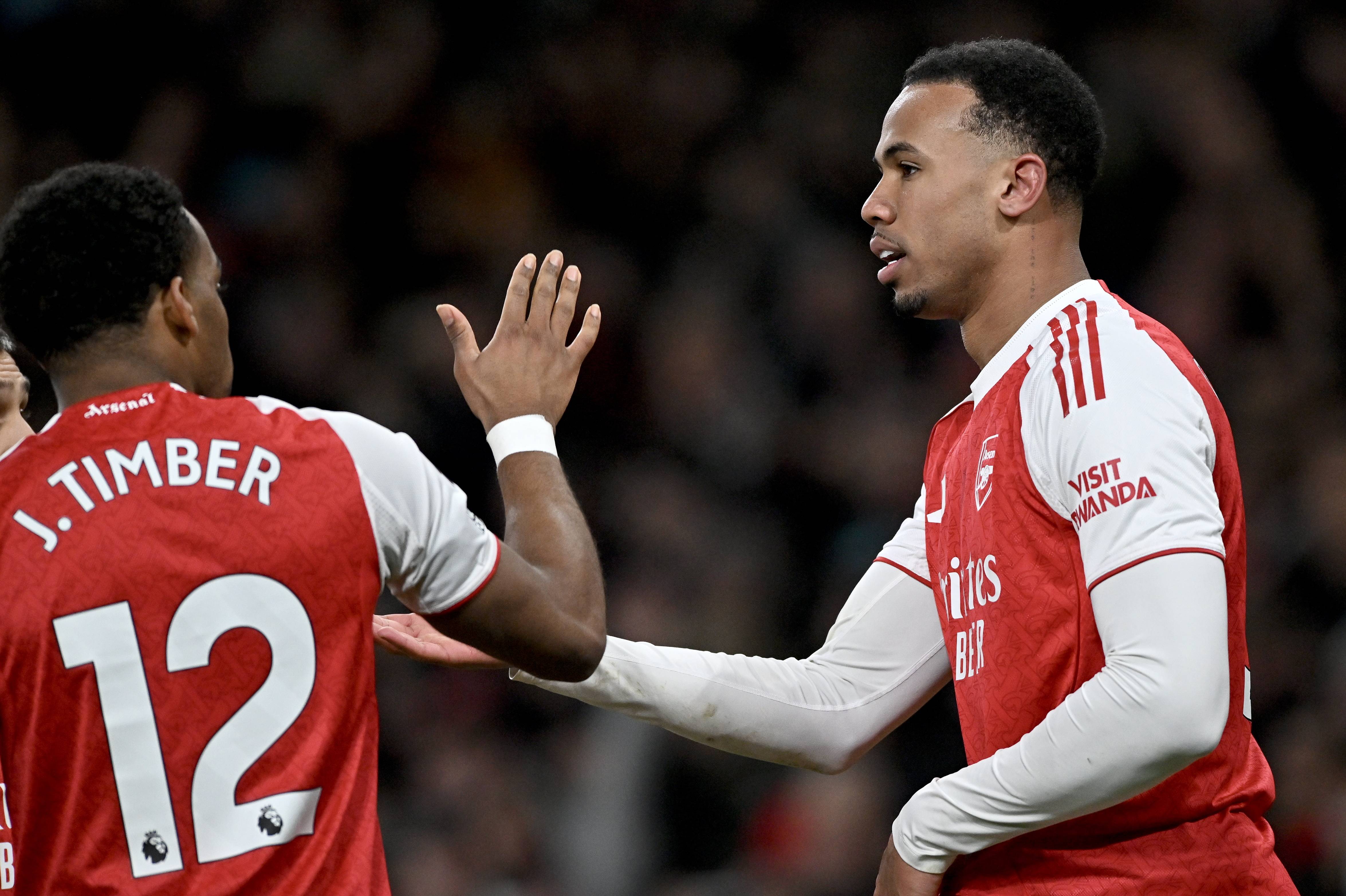 เมื่อวันที่ 30 ธันวาคม กาเบรียล (ขวา) นักเตะอาร์เซนอล ฉลองกับเพื่อนร่วมทีม ทิมเบิล หลังจากทำประตูเปิดให้กับทีม สำนักข่าวซินหัว/EPA