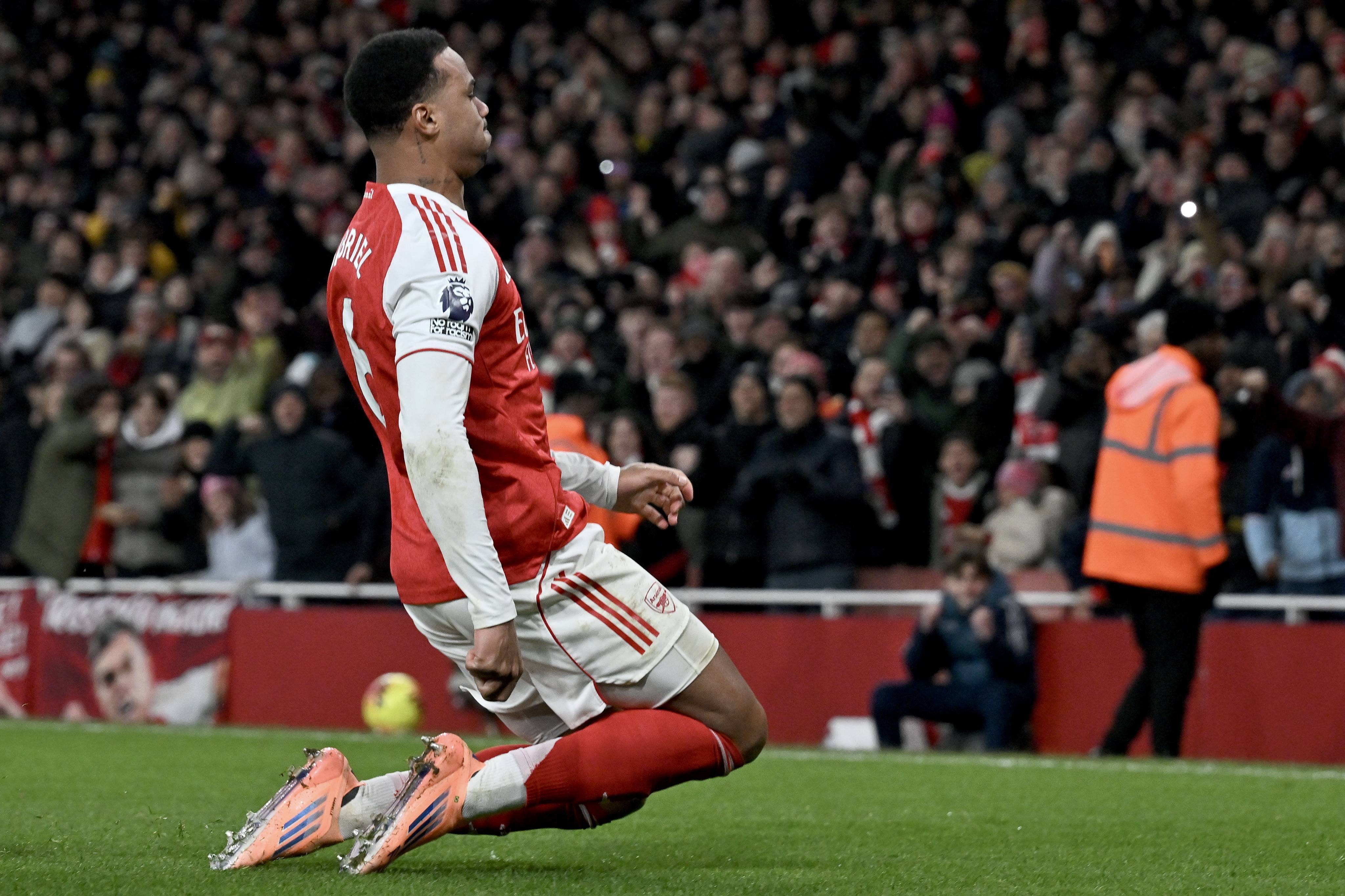 เมื่อวันที่ 30 ธันวาคม กาเบรียล (ขวา) นักเตะอาร์เซนอล ฉลองการทำประตูเปิดให้กับทีมของเขา สำนักข่าวซินหัว/EPA