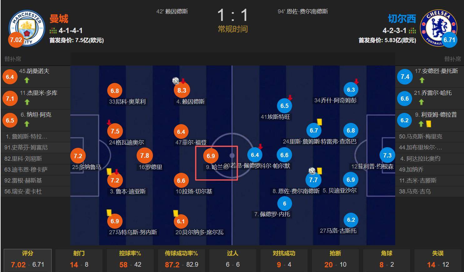 แมนเชสเตอร์ ซิตี้ เสมอกับเชลซี 1-1 เออร์ลิง ฮาแลนด์ ลงเป็นตัวจริงและเล่นครบ 90 นาที แต่ไม่สามารถทำประตูได้ โดยได้รับคะแนนหลังจบการแข่งขันที่ 6.9