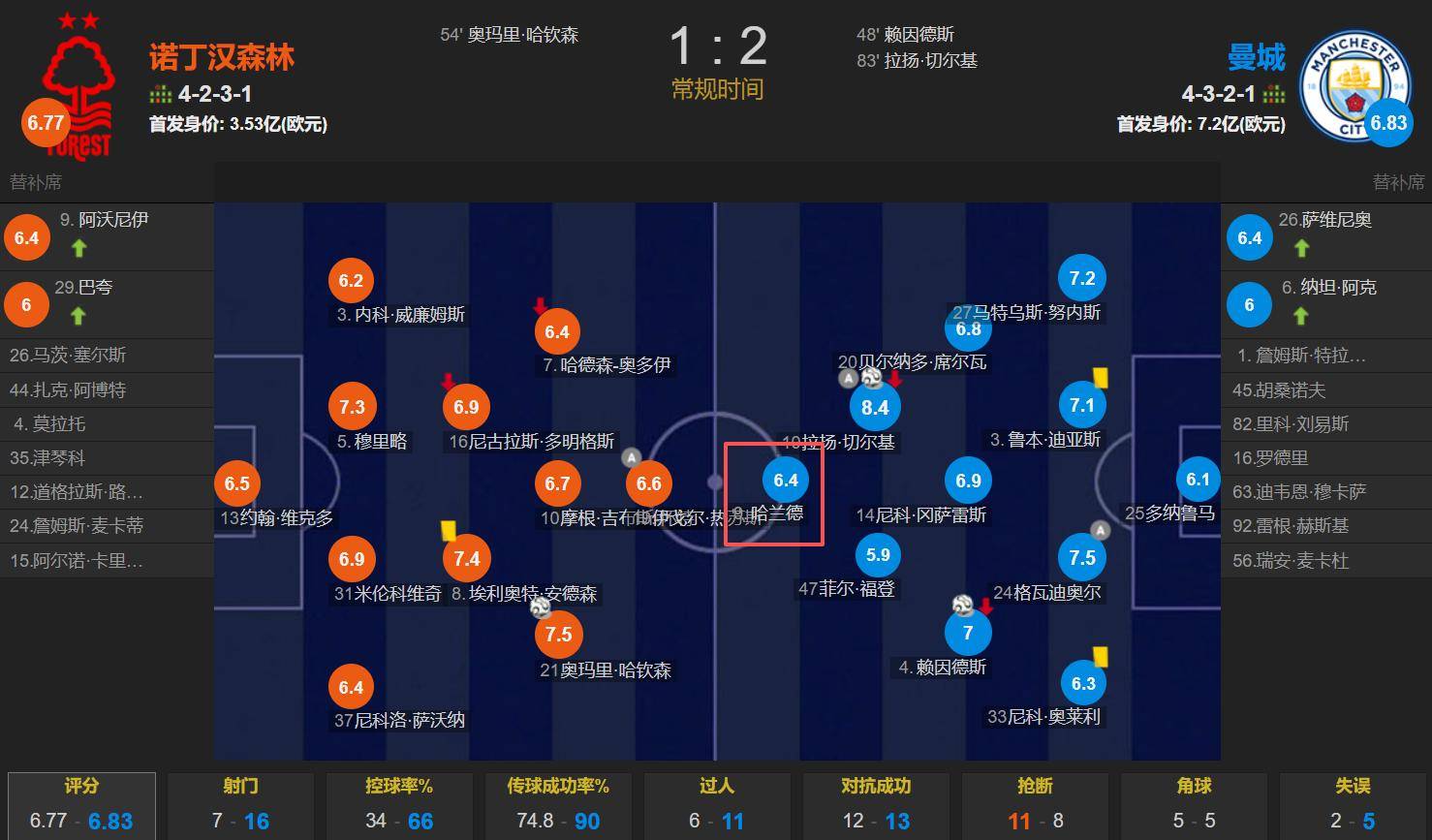 แมนเชสเตอร์ ซิตี้ 2-1 น็อตติงแฮม ฟอเรสต์: ฮาแลนด์ออกสตาร์ทเป็นตัวจริงและลงเล่นครบ 90 นาทีเต็ม แต่ไม่สามารถทำประตูได้ โดยได้รับคะแนนหลังจบเกมอยู่ที่ 6.4