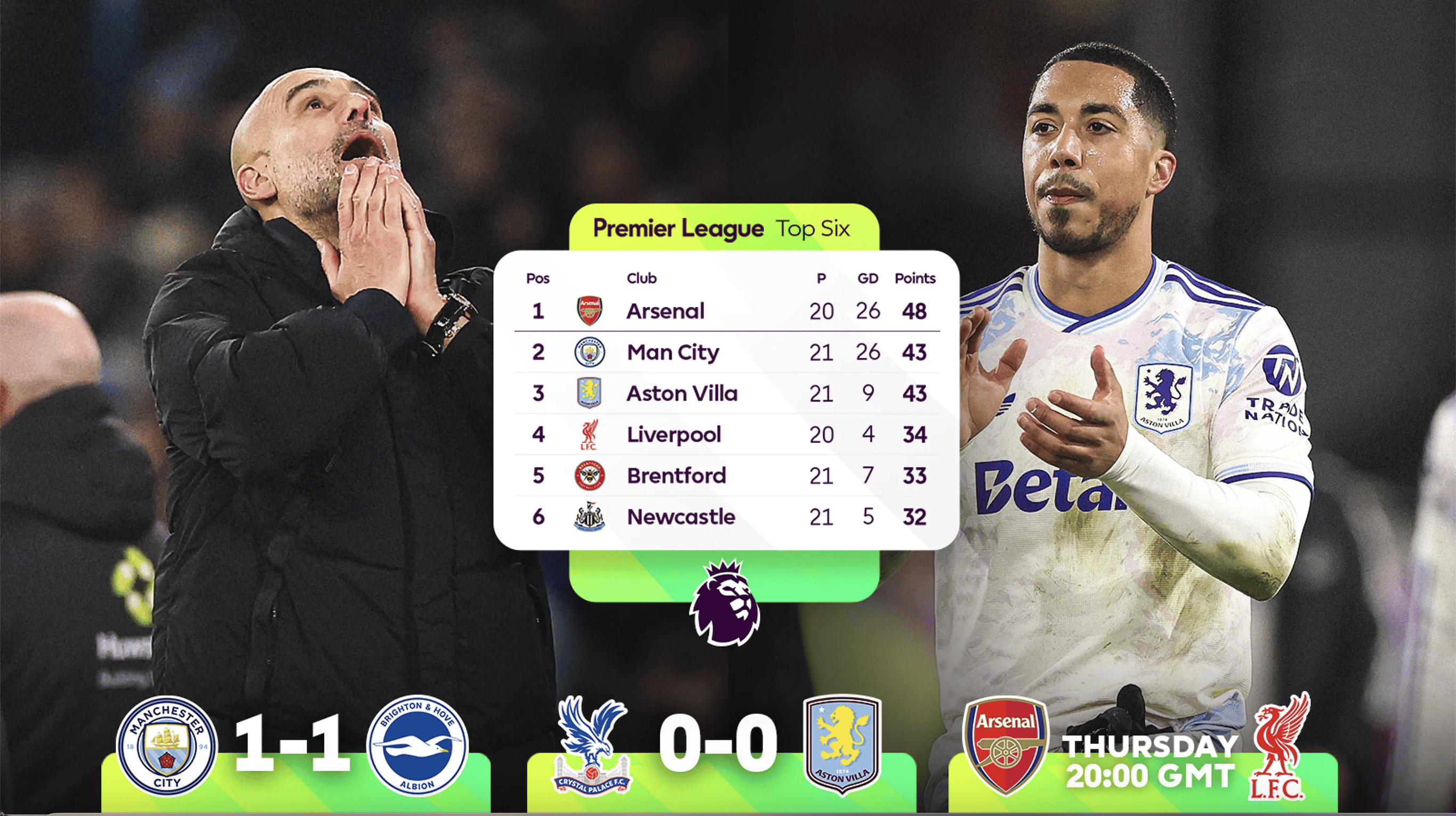 ปัจจุบัน แมนเชสเตอร์ ซิตี้ และ แอสตัน วิลล่า ต่างมี 43 คะแนนเท่ากัน ครองอันดับสองและสามตามลำดับในตารางลีก หากผู้นำ อาร์เซนอล สามารถเอาชนะ ลิเวอร์พูล ในบ้านได้ในวันที่ 8 พวกเขาจะขยายความได้เปรียบที่จุดสูงสุดเป็น 8 คะแนน