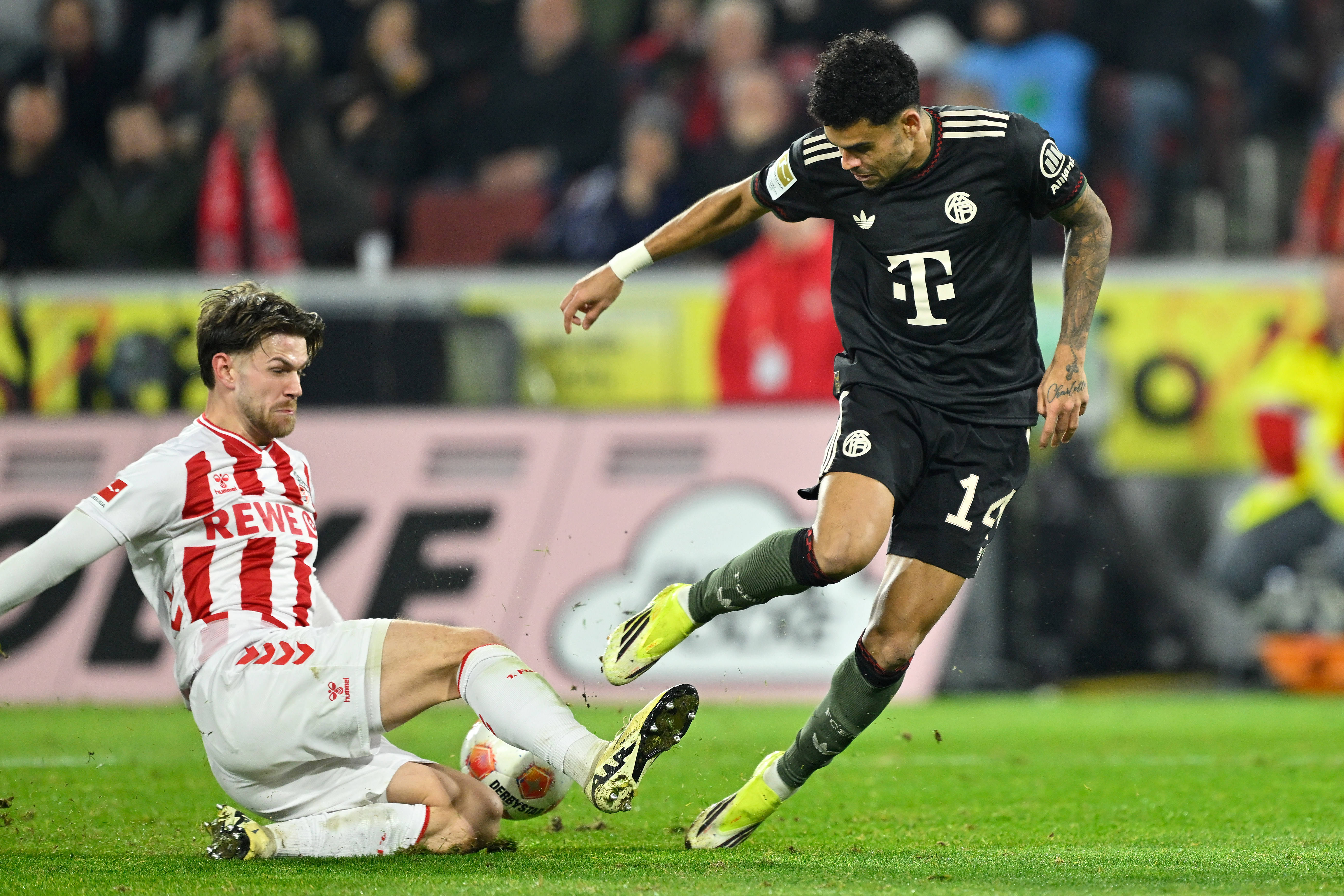เมื่อวันที่ 14 มกราคม ดิอาซของบาเยิร์น มิวนิค (ซ้าย) และซิมป์สันของโคโลญจน์ต่อสู้เพื่อแย่งบอลระหว่างการแข่งขัน สำนักข่าวซินหัว (ภาพโดย Ulrich Hufnagel)