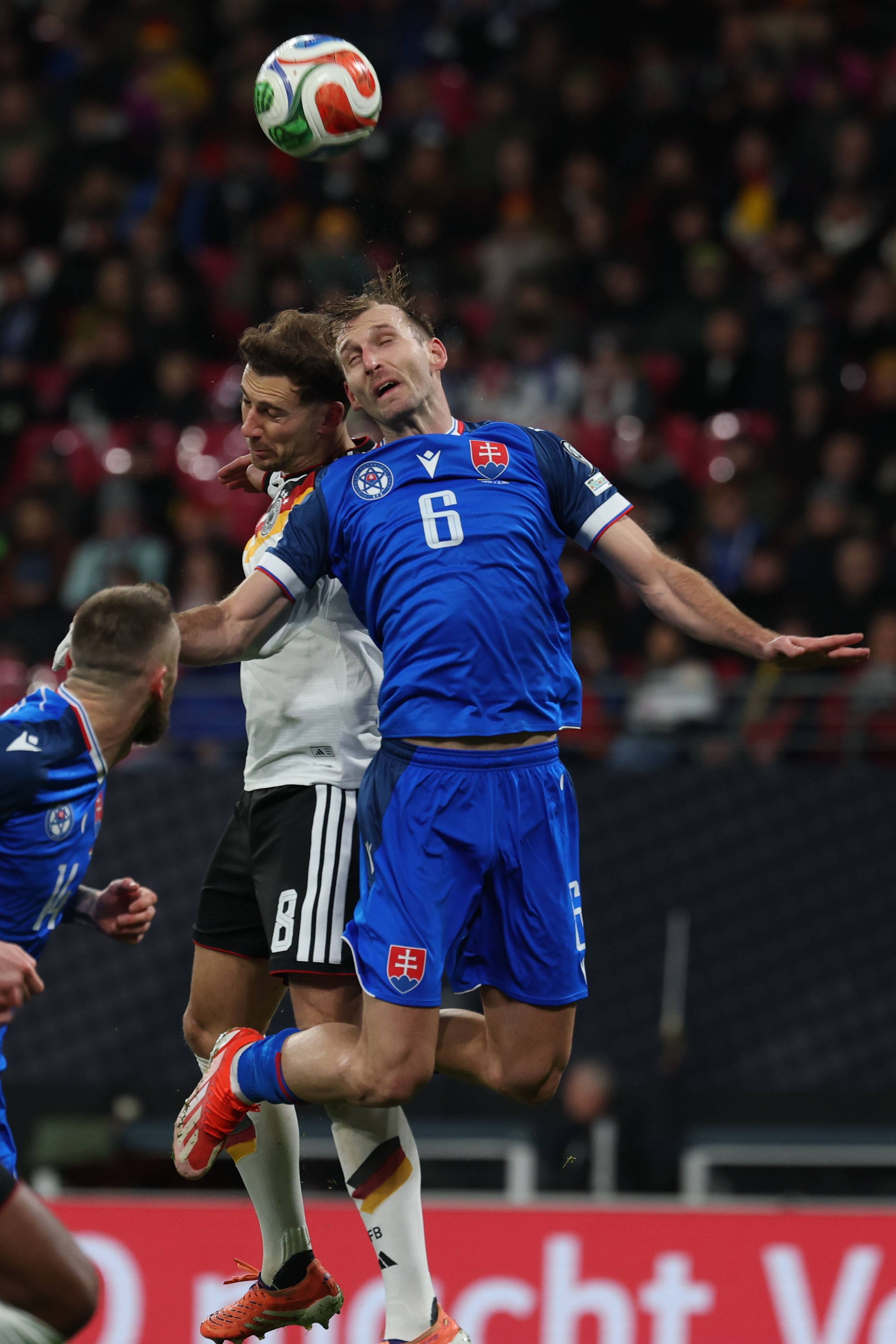 เมื่อวันที่ 17 พฤศจิกายน ลีออน โกเร็ตซ์ก้า ของเยอรมนี (ซ้าย) เข้าปะทะกับมาร์ติน ไซเบิลเลอร์ ของสโลวาเกียเพื่อแย่งบอล ซีเอ็นเอ/อีพีเอ