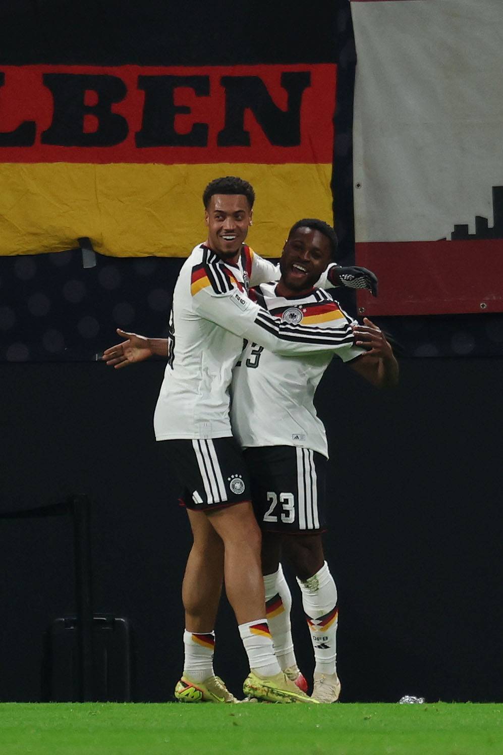 เมื่อวันที่ 17 พฤศจิกายน เซิร์จ กนาบรี ของเยอรมนี (ขวา) ฉลองกับเพื่อนร่วมทีมหลังจากทำประตูที่สองให้กับทีมของเขา ซินหัว/EPA