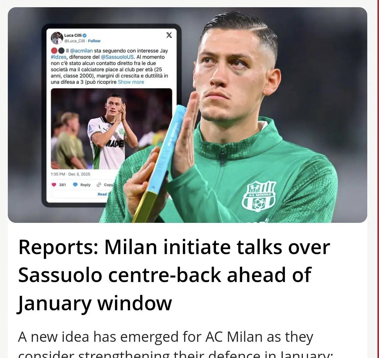 ชื่อใหม่ปรากฏขึ้นขณะที่มิลานเสริมความแข็งแกร่งในแนวรับ: เจย์ อิดเซียร์ จากซาสซูโอโล่