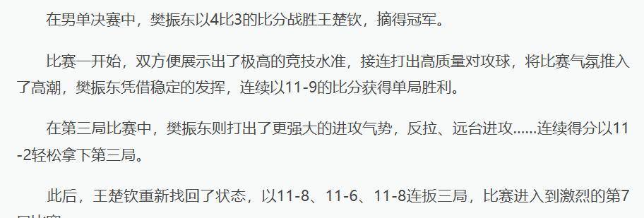 อย่างไรก็ตาม นี่ไม่ใช่บทสุดท้าย การตอบสนองที่น่าประทับใจที่สุดมาจากเวทีกีฬาสูงสุดของประเทศ—การแข่งขันกีฬาแห่งชาติ ในรอบชิงชนะเลิศประเภทชายเดี่ยว เมื่อเผชิญหน้ากับหลิน ซิโดง ผู้มีจิตวิญญาณอันแรงกล้า ฟาน เจ๋อดงได้แสดงให้เห็นถึงความเหนือชั้นและประสบการณ์ที่สั่งสมมา เขาคงความสงบตลอดการแข่งขัน โจมตีอย่างเด็ดขาดในช่วงเวลาสำคัญ จนสามารถรักษาตำแหน่งแชมป์ชายเดี่ยวไว้ได้สำเร็จ! เมื่อได้รับข่าวชัยชนะ หนังสือพิมพ์เหรินหมินรื่อเป้าได้ออกประกาศชื่นชมอย่างเป็นทางการถึงเขาเป็นการส่วนตัว