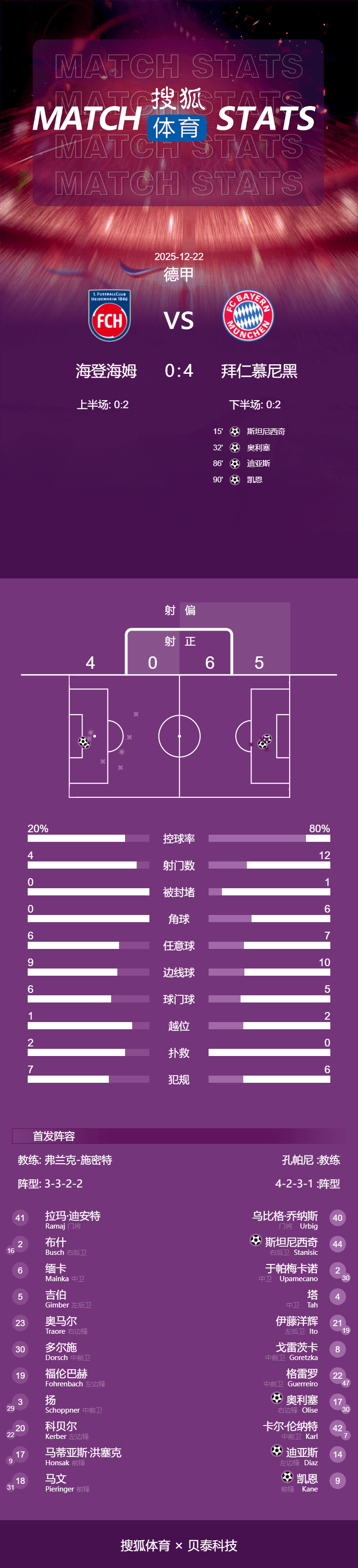 เวลา 00:30 น. ตามเวลาปักกิ่ง วันที่ 22 ธันวาคม บาเยิร์น มิวนิค เดินทางไปพบกับไฮเดนไฮม์ ในรอบที่ 15 ของบุนเดสลีกาในครึ่งแรก สตานิซิชโหม่งบอลเข้าประตูให้บาเยิร์นขึ้นนำ ก่อนที่โอลิชจะยิงเพิ่มเป็นสองประตู ทำให้บาเยิร์นนำ 2-0 ในช่วงพักครึ่ง หลังจากพักครึ่ง ดิอาซก็ปิดท้ายชัยชนะให้บาเยิร์น และเคนยิงประตูที่สี่ในช่วงทดเวลาบาดเจ็บ บาเยิร์นเอาชนะไฮเดนไฮม์ไป 4-0 ทำให้พวกเขายังคงนำเป็นจ่าฝูงของตารางต่อไป โดยไม่แพ้ใครในบุนเดสลีกาฤดูกาลนี้