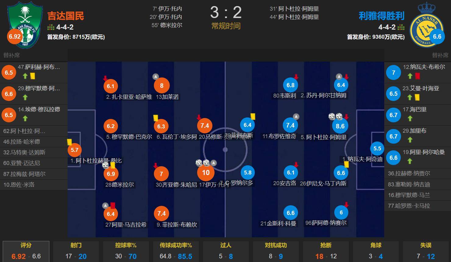อัล นาสร์ ครองเกมได้อย่างเหนือชั้นในเกมเยือน ควบคุมเกมได้อย่างเหนียวแน่นต่อทีมอัล อิตติฮัดที่เต็มไปด้วยผู้เล่นบาดเจ็บ พร้อมทั้งครองบอลถึง 70% อย่างน่าทึ่ง อย่างไรก็ตาม การโต้กลับของอัล อิตติฮัดกลับเฉียบคมอย่างเหลือเชื่อ เกมกลายเป็นสงครามการยิงประตู: อัล นาสร์ ยิงถึง 20 ครั้ง ขณะที่อัล อิตติฮัดทำได้ 17 ครั้ง อัล นาสร์ สามารถเปลี่ยนโอกาสเป็นประตูได้เพียง 4 ครั้ง ขณะที่อัล อิตติฮัดทำได้ถึง 7 ประตูอดีตดาวซัลโวพรีเมียร์ลีกอย่างอีวาน ยิงไปทั้งหมดห้าครั้ง สองครั้งเข้ากรอบ ทำประตูได้สองครั้งและทำอีกหนึ่งแอสซิสต์ ในทางตรงกันข้าม คริสเตียโน่ โรนัลโด้ มีโอกาสยิงสี่ครั้งแต่ไม่มีครั้งใดเข้ากรอบ พลาดโอกาสทองในการทำประตูแบบตัวต่อตัวหลังจากควบคุมบอลผิดพลาดเฟลิกซ์แทบจะส่งบอลให้โรนัลโด้ถึงเท้าแล้ว แต่ดาวเตะชาวโปรตุเกสกลับไม่สามารถเปลี่ยนโอกาสให้เป็นประตูได้