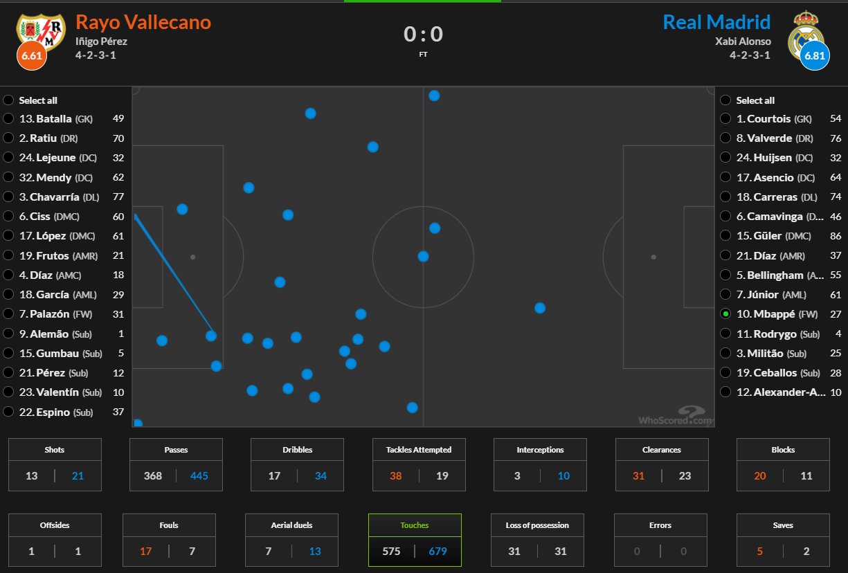 ต้องยอมรับว่าทั้งสองทีมมีความสูสีกันในสนาม โดยเรอัล มาดริดไม่สามารถแสดงให้เห็นถึงข้อได้เปรียบที่ชัดเจนได้ ซึ่งสิ่งนี้ยังเกี่ยวข้องกับนิสัยการรับบอลของเอ็มบัปเป้อีกด้วย ตลอดทั้งเกม เขาได้สัมผัสบอลเพียงสามครั้งในเขตโทษของเรอัล เบติส ซึ่งเท่ากับจำนวนครั้งที่เขาทำได้ในนัดก่อนที่พบกับลิเวอร์พูล