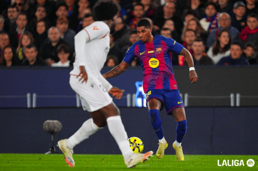 2-0! กัปตันยิงสองประตูพาทีมยักษ์ใหญ่ราคา 110 ล้านปอนด์คว้าชัยชนะในลีกเป็นนัดที่เจ็ดติดต่อกัน ขยายช่องว่างนำจ่าฝูงเป็นเจ็ดแต้มเหนือคู่ปรับตลอดกาล_บาร์เซโลนา_แรชฟอร์ด_โอซาซูนา
