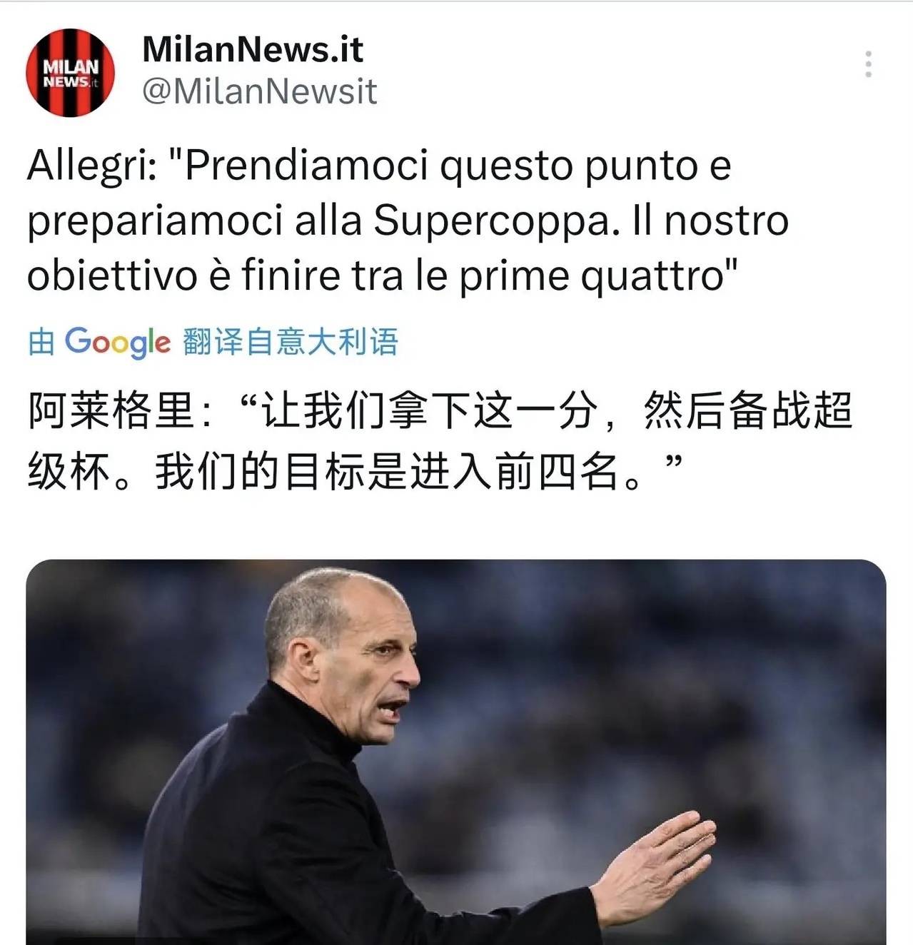 เป้าหมายคือการจบในอันดับสี่อันดับแรก! อัลเลกรีกล่าวในการให้สัมภาษณ์ว่าการเสมอกับคู่แข่งเช่นนี้เป็นเรื่องที่น่าหงุดหงิดอย่างไม่ต้องสงสัย แต่การได้หนึ่งคะแนนก็ยังถือว่ายอมรับได้ เป้าหมายของเราคือการจบในอันดับสี่อันดับแรก ไม่ใช่การแข่งขันเพื่อแชมป์ส่วนตัวแล้ว ผมคิดว่าอัลเลกรีจัดการสถานการณ์ได้ดีทีเดียว หลังจากเสมอกับยูเวนตุส เขาได้กล่าวว่าเราทิ้งสามแต้มที่ควรจะเป็นของเราไปอย่างน่าเสียดาย ซึ่งเขาเห็นว่าสิ่งนี้เป็นสิ่งที่ยอมรับไม่ได้ การเจอกับคู่แข่งที่แข็งแกร่งช่วยสร้างความมั่นใจให้กับนักเตะ เราสามารถเอาชนะยูเวนตุสได้ แต่ความผิดพลาดทำให้เราเสียสองแต้ม การเสมอกับทีมที่อ่อนกว่า อัลเลกรีเน้นย้ำว่าเป้าหมายของทีมคือการลดความกดดันให้กับผู้เล่น นั่นคือแนวทางที่ผู้จัดการทีมที่ดีควรทำ