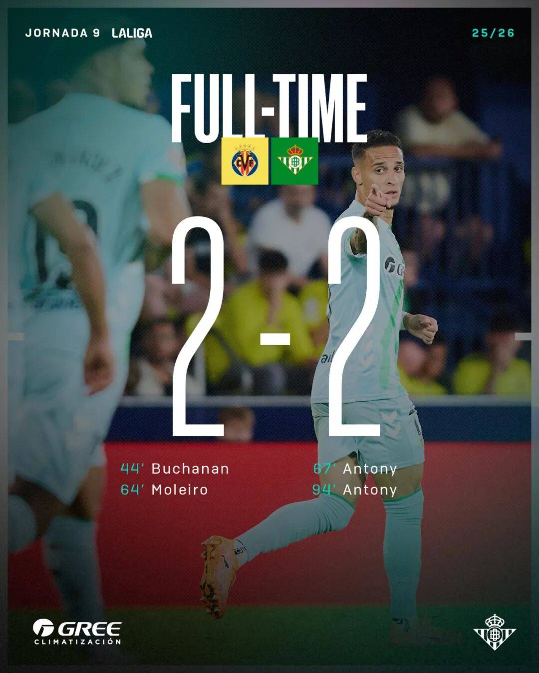 จบเกมการแข่งขัน เรอัล เบติส เปิดบ้านเสมอกับ บียาร์เรอัล 2-2 ในศึกลาลีกา สเปน นัดล่าสุด เป็นการพบกันในช่วงต้นของทั้ง 2 ฝ่าย เพื่อคว้าสิทธิ์ไปเล่นยูฟ่า แชมเปียนส์ลีก บียาร์เรอัล 2 ประตูติดต่อกัน โดย ทาจอน บูชานัน และ อัลแบร์โต โมเลโร,ปีกชาวแคนาดา ที่ย้ายมาจากอินเตอร์ มิลาน อย่างเป็นทางการในฤดูกาลนี้ ซัดไปแล้ว 4 ประตู และ อัลแบร์โต โมเลโร วัย 22 ปี ที่ย้ายมาจากลาส พัลมาส แต่เรอัลเบติสเสมอครั้งที่สองโดย Anthony May และเขาก็ได้รับการเปิดตัวในลาลีกาในฤดูกาลนี้ เรอัล เบติส ออกสตาร์ตฤดูกาลนี้ได้ดีกว่าฤดูกาลที่แล้ว โดยขณะนี้พวกเขาตามหลังอันดับ 4 สเปนอยู่ 2 คะแนน เรอัล เบติส 0-0 ในศึกยูโรปา ลีก เมื่อวันพฤหัสบดีที่ผ่านมา โดยเสมอกับ เฮนเก ทีมจากเบลเยียม และนัดล่าสุดที่ทั้งคู่เก็บชัยชนะเป็นเกมเยือน 4 นัดติดต่อกัน แอนโธนีและเซ็นเตอร์ฮาล์ฟโกเมซเป็นผู้เล่นเพียงคนเดียวที่ออกสตาร์ตติดต่อกัน อู๋เสียนกองหน้าของเฮนเก้พลาดโอกาสที่ดีในการยิงเสากลางในการโต้กลับในครึ่งหลังและในที่สุดทั้งสองฝ่ายก็ไม่ประสบความสําเร็จในการแลกเปลี่ยนกระดาษเปล่า