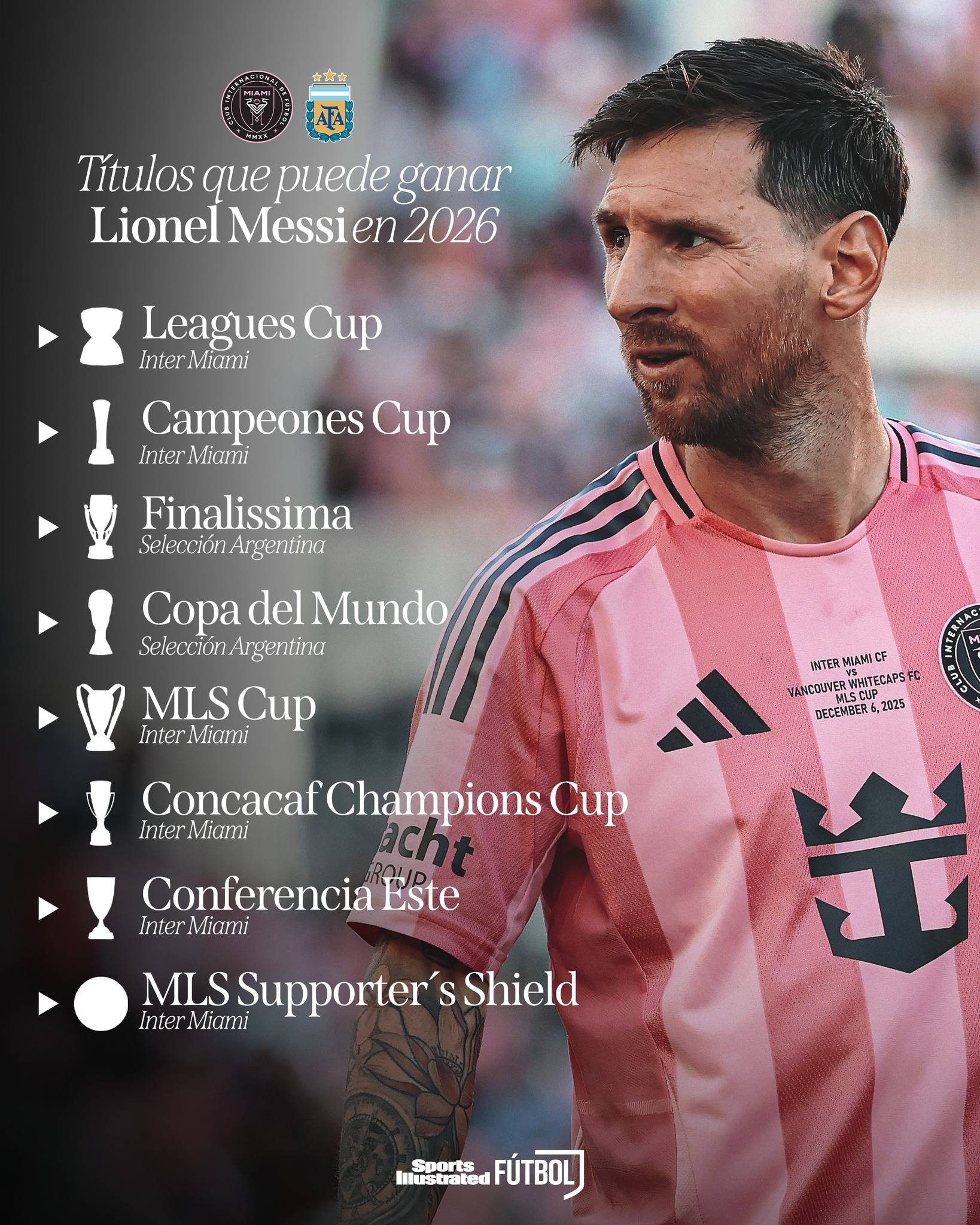 26 ธันวาคม ฉบับภาษาสเปนของส่วนฟุตบอลในนิตยสาร Sports Illustrated ได้เผยแพร่การอัปเดตที่ระบุถึงถ้วยรางวัลไม่น้อยกว่าแปดรายการที่ Lionel Messi อาจมีโอกาสท้าทายในปีหน้า โดยฟุตบอลโลกเป็นอันดับแรก ซึ่งเป็นเกียรติที่เขาให้คุณค่ามากที่สุด แม้ว่า Messi จะเคยคว้าแชมป์ฟุตบอลโลกมาแล้วหนึ่งครั้ง – โดยนำทีมของเขาไปสู่ชัยชนะด้วยผลงานที่ได้รับการยกย่องว่าดีที่สุดในประวัติศาสตร์ของทัวร์นาเมนต์ – แต่ถ้วยรางวัลเพิ่มเติมก็ยังคงเป็นสิ่งที่น่ายินดีเสมอดังนั้น แม้ว่าเมสซี่จะยังไม่ได้ยืนยันการเข้าร่วมการแข่งขันฟุตบอลโลกในปีหน้าอย่างเป็นทางการ แต่ก็มีข้อสันนิษฐานกันอย่างกว้างขวางว่าผู้เล่นที่มีฟอร์มการเล่นโดดเด่นเช่นนี้ – ซึ่งไม่เพียงแต่พาทีมคว้าชัยชนะเท่านั้น แต่ยังคว้ารางวัล MVP ถึงห้าครั้งภายในไม่กี่วัน – จะเข้าร่วมการแข่งขันในทัวร์นาเมนต์นี้อย่างแน่นอน