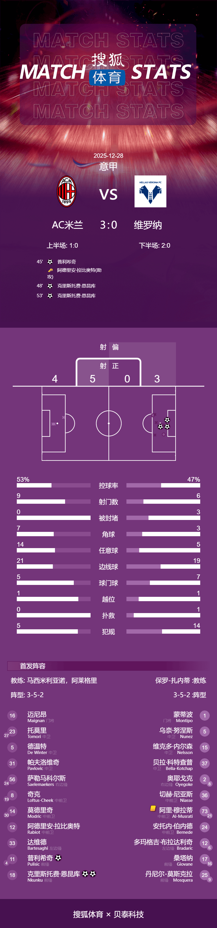 เวลา 19:30 น. ตามเวลาปักกิ่ง วันที่ 28 ธันวาคม 2025 เอซี มิลาน เปิดบ้านต้อนรับการมาเยือนของเฮลลาส เวโรนา ในรอบที่ 17 ของเซเรีย อา ในครึ่งแรก คริสเตียน พูลิซิช ทำประตูแรกของเกมได้จากการแอสซิสต์ของอาเดรียน ราบิโอต์ หลังจากพักครึ่ง คริสโตเฟอร์ เอ็นคุนคู ยิงจุดโทษเข้าไป ก่อนจะทำประตูที่สองของตัวเองเพื่อทำแฮตทริก และทำให้เวโรนาไม่สามารถทำประตูได้ ในที่สุด เอซี มิลาน ก็เอาชนะเฮลลาส เวโรนา ไปได้ 3-0 อย่างสมบูรณ์แบบ