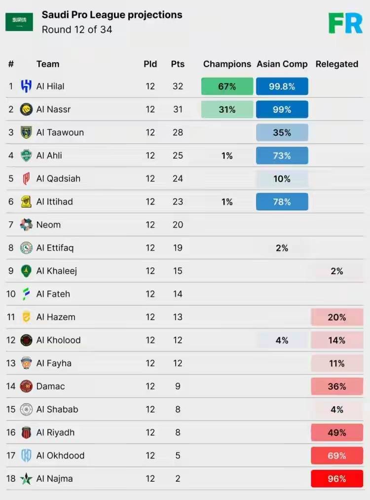 หลังจากที่อัล-นาสเซอร์แซงหน้าอัล-ฮิลาลในตารางคะแนนลีก แนวโน้มการคว้าแชมป์ล่าสุดของซาอุดิ โปร ลีกได้รับการอัปเดตแล้ว โอกาสที่อัล-นาสเซอร์จะคว้าแชมป์เพิ่มขึ้นเป็น 67% ในขณะที่โอกาสของอัล-ฮิลาลของคริสเตียโน โรนัลโดลดลงเหลือ 31% นี่แสดงให้เห็นว่าสื่อต่างประเทศอย่าง Footy Rankings ยังคงสงสัยในความสามารถของโรนัลโดที่จะนำอัล-ฮิลาลคว้าแชมป์ซาอุดิ โปร ลีกในฤดูกาลนี้เพื่อตอบสนองความปรารถนาในการคว้าแชมป์ของโรนัลโด้ อัล นาสร์ได้รวบรวมทีมที่เต็มไปด้วยดาวดังในฤดูกาลนี้ โดยเซ็นสัญญากับนักเตะทีมชาติโปรตุเกสอย่าง João Félix ในช่วงที่เขากำลังอยู่ในจุดสูงสุดของอาชีพ พร้อมกับปีกของบาเยิร์น มิวนิคอย่าง Kingsley Coman อย่างไรก็ตาม รูปแบบการเล่นปัจจุบันของโรนัลโด้ ซึ่งพึ่งพาโอกาสการทำประตูในเขตโทษอย่างมาก ทำให้ทีมต้องแบกรับภาระทางแท็คติกมากเกินไป นับตั้งแต่ซาดิโอ มาเน่ย้ายไปแข่งขันแอฟริกา คัพ ออฟ เนชั่นส์ อัล นาสร์ก็ประสบปัญหาอย่างเห็นได้ชัดในการรักษาจังหวะการเล่นของพวกเขาในสถานการณ์เช่นนี้ ความหวังในการคว้าแชมป์ลีกของอัล นาสร์ได้พังทลายลงแล้ว ความเป็นไปได้ที่โรนัลโดจะจบอาชีพกับอัล นาสร์ในฤดูกาลนี้โดยไม่มีถ้วยรางวัลยังคงสูงอยู่ บางทีความหวังเดียวของพวกเขาอาจอยู่ที่เอเอฟซี แชมเปียนส์ลีก – การแข่งขันที่มีระดับต่ำกว่าซึ่งพวกเขาอาจมีโอกาสคว้าถ้วยรางวัลมาครองได้...