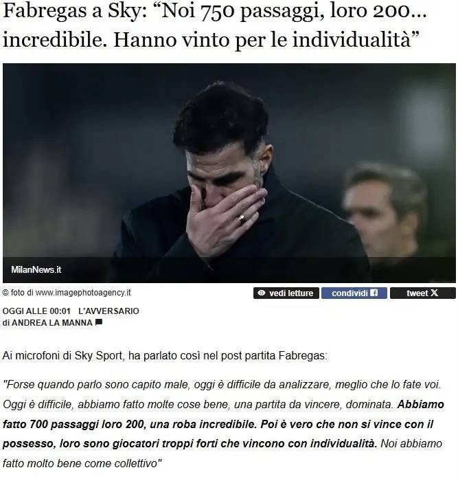 กระแสสื่อเซเรียอา: มิลานทำได้เพียง 200 ครั้งในการส่งบอล ขณะที่โคโมคลับทำได้ถึง 750 ครั้ง แต่สุดท้ายมิลานก็คว้าชัยชนะไปได้_อัลเลกรี_ฟาเบรกาส_ฟุตบอล