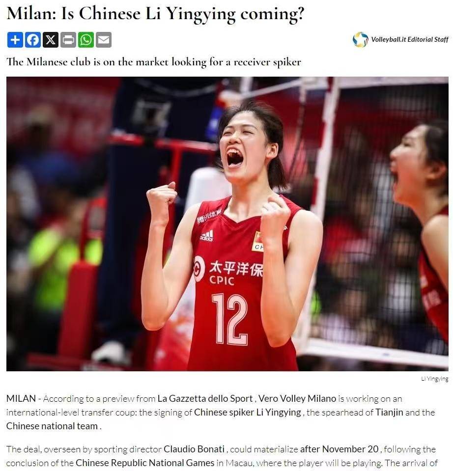 โชคดีที่การพัฒนาล่าสุดนำมาซึ่งข่าวดี: สื่ออิตาลี Gazzetta dello Sport รายงานว่า สโมสรวอลเลย์บอลหญิงมิลานกำลังดำเนินการอย่างจริงจังในการเซ็นสัญญากับ หลี่ หยิงหยิง โดยเข้าใจว่าผู้อำนวยการกีฬาของมิลาน บอนัตติ จะดูแลการย้ายทีมของหลี่ หยิงหยิงเป็นการส่วนตัว เนื่องจากการมีส่วนร่วมโดยตรงของบอนัตติ โอกาสที่หลี่ หยิงหยิงจะได้เริ่มต้นอาชีพในต่างประเทศจึงมีสูงมาก