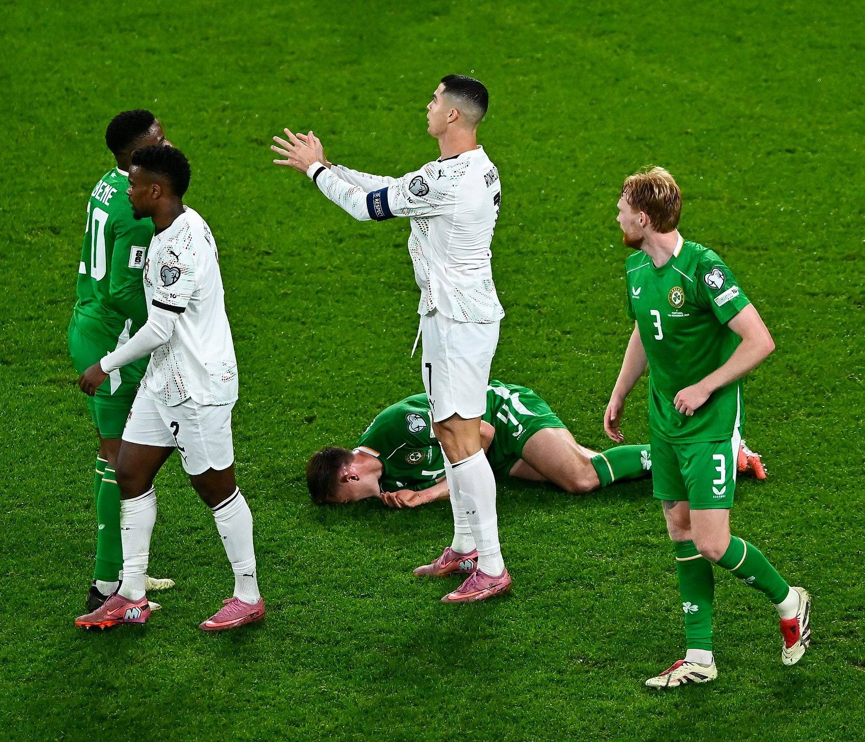 ช่วงเวลาที่สร้างความขัดแย้งเกิดขึ้นระหว่างการแข่งขัน: คริสเตียโน โรนัลโด ถูกผู้ตัดสินแจกใบแดงโดยตรงหลังจากมีการตรวจสอบ VAR เนื่องจากเขาใช้ศอกกระแทกผู้เล่นชาวไอริช ดารา โอเชีย