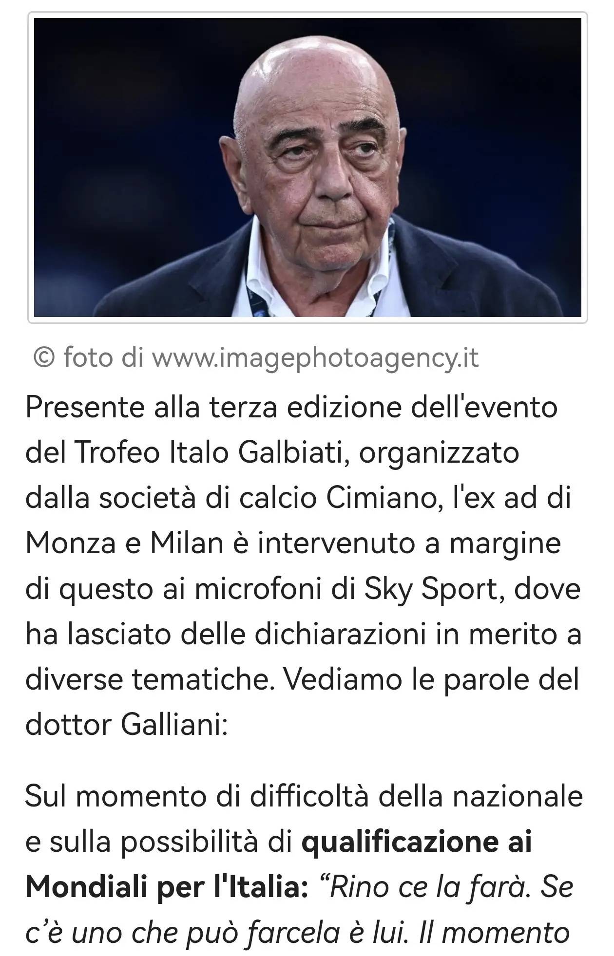 อดีตประธานกรรมการบริหารของเอซี มิลาน และมอนซ่า อาเดรียโน่ กัลเลียนี ได้เข้าร่วมงานมอบรางวัลอิตาโล การ์บีอาตี โทรฟี ครั้งที่สาม ซึ่งจัดโดยสโมสรฟุตบอลชิเมโร่ ในระหว่างช่วงพักการแข่งขัน เขาได้ให้สัมภาษณ์กับสกาย สปอร์ต โดยหารือเกี่ยวกับหัวข้อต่าง ๆ มากมาย