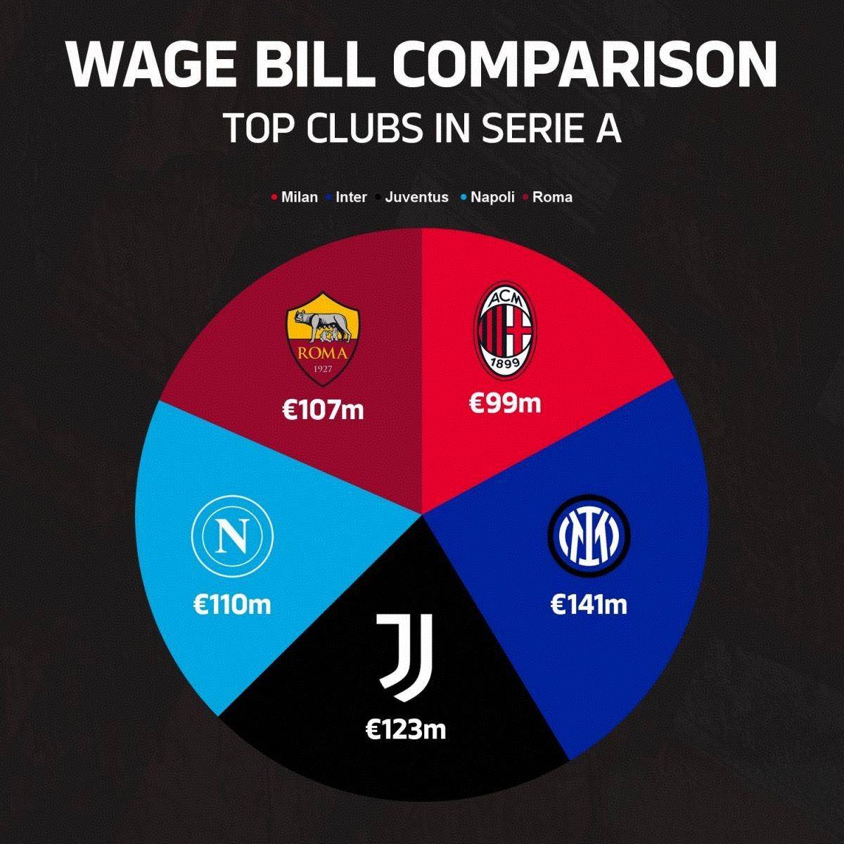 ยูเวนตุส, นาโปลี และโรม่า อยู่ในอันดับที่สองถึงสี่ในเซเรียอาตามงบประมาณค่าจ้างเมื่อคำนวณยอดรวมของค่าจ้างและค่าเสื่อมราคาทั้งหมด นาโปลีเป็นผู้นำในตารางด้วยจำนวน 232 ล้านยูโร ตามมาอย่างใกล้ชิดโดยยูเวนตุสที่ 231 ล้านยูโร เอซี มิลานอยู่ในอันดับที่สามที่ 193 ล้านยูโร อินเตอร์ มิลานอยู่ในอันดับที่สี่ที่ 192 ล้านยูโร และโรม่าอยู่ในอันดับที่ห้าที่ 158 ล้านยูโร