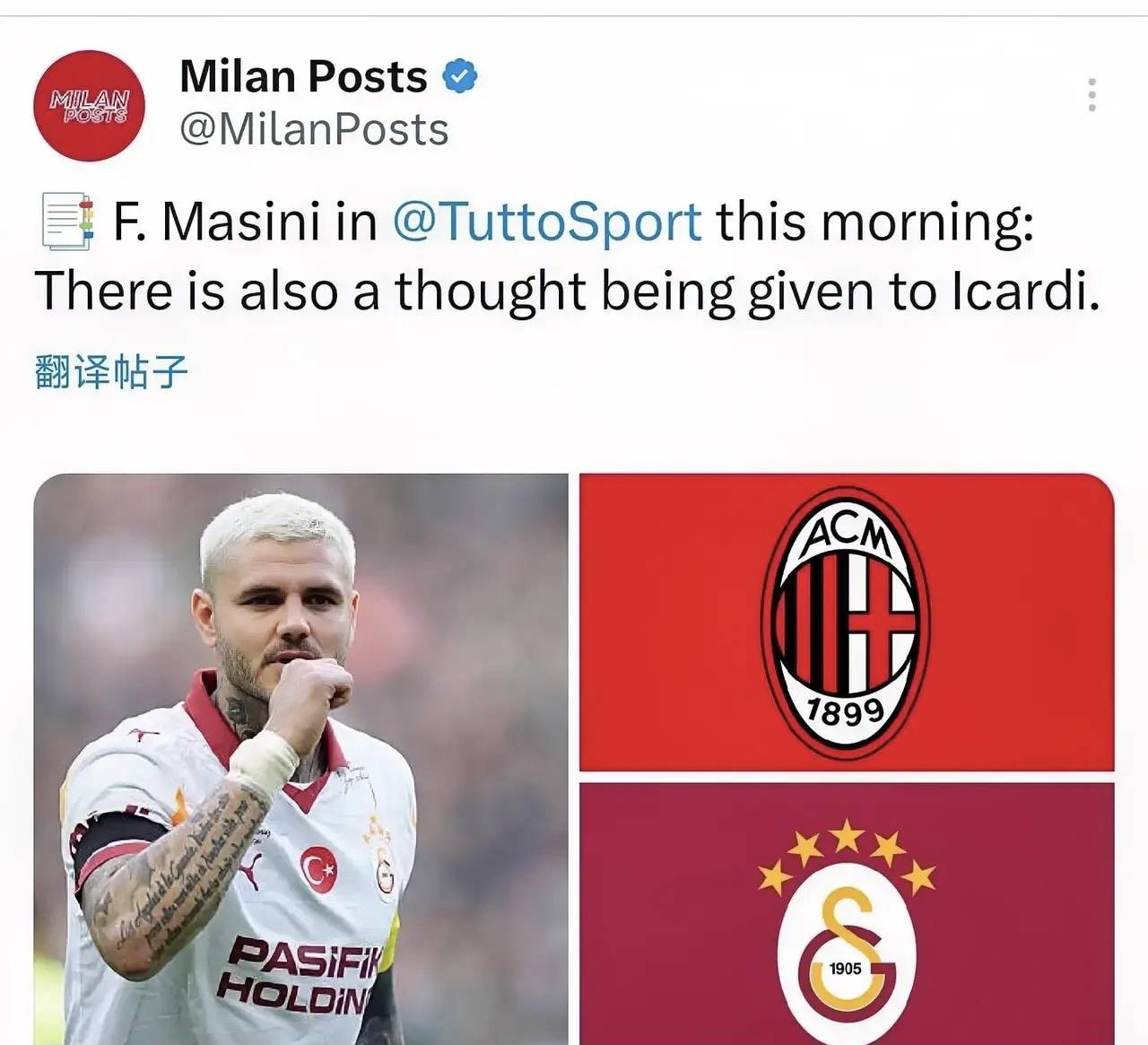 สื่ออิตาลีรายงานว่า: ในขณะที่ทาเร่กำลังไล่ล่าเฟอร์ครูเกอร์อย่างเต็มที่ ชื่อของอิคาร์ดี้ก็ยังคงปรากฏอยู่ในรายชื่อนักเตะที่มิลานต้องการเสริมทัพในช่วงตลาดซื้อขายนักเตะฤดูหนาวอย่างต่อเนื่อง