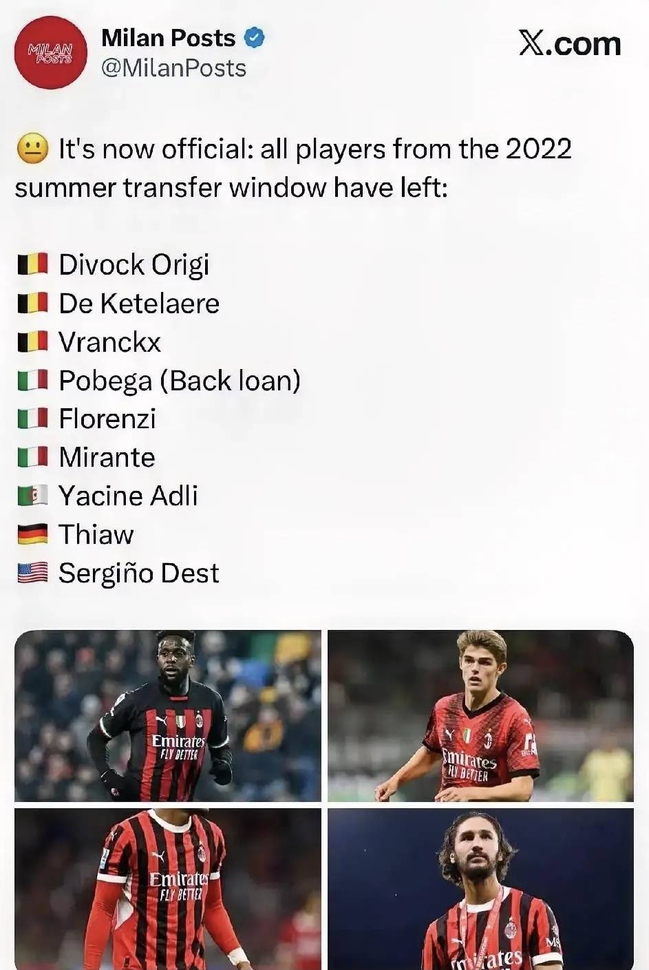 สื่ออิตาลีฮือฮากัน: ผู้เล่นทุกคนที่มิลานเซ็นสัญญาในช่วงตลาดซื้อขายนักเตะฤดูร้อนปี 2022 ได้ย้ายออกไปหมดแล้ว พร้อมกับการเปลี่ยนแปลงผู้จัดการทีมและนักเตะอย่างมากมายในช่วงสามปีที่ผ่านมา อัลเลกรีมาถึงแล้ว