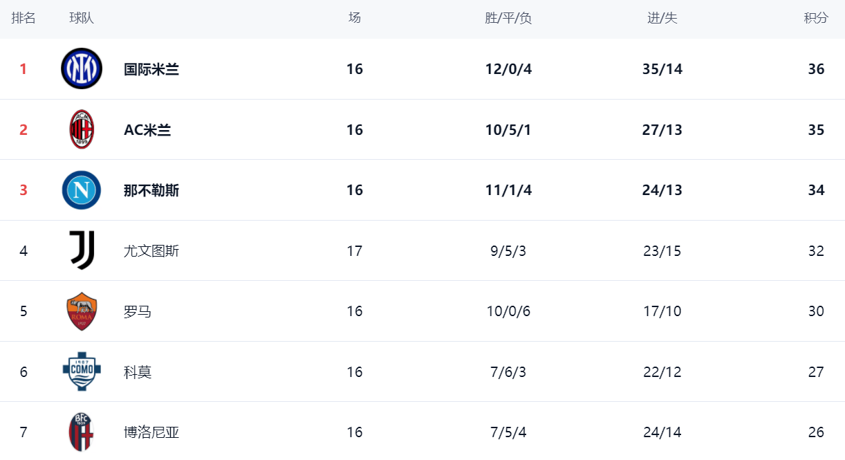 ในตารางลีก อินเตอร์ มิลาน นำเป็นจ่าฝูงด้วยคะแนน 36 คะแนน อันดับสองคือ เอซี มิลาน ที่เก็บได้ 35 คะแนน ตามหลังเพียงหนึ่งคะแนน นาโปลี อยู่ในอันดับสามด้วยคะแนน 34 คะแนน ตามหลังอย่างใกล้ชิดยูเวนตุสครองอันดับสี่ด้วยคะแนน 32 คะแนน ด้วยการที่สี่อันดับแรกมีคะแนนห่างกันเพียงสี่คะแนน การแข่งขันชิงแชมป์ยังคงดุเดือด และอันดับอาจเปลี่ยนแปลงได้หลังจากทุกนัด โรมาอยู่ในอันดับห้าด้วยคะแนน 30 คะแนน ห่างจากกลุ่มแชมป์ไปบ้าง โคโมอยู่ในอันดับหกด้วยคะแนน 27 คะแนน โบโลญญาอยู่ในอันดับเจ็ดด้วยคะแนน 26 คะแนน ขณะที่ลาซิโออยู่ในอันดับแปดด้วยคะแนน 24 คะแนน