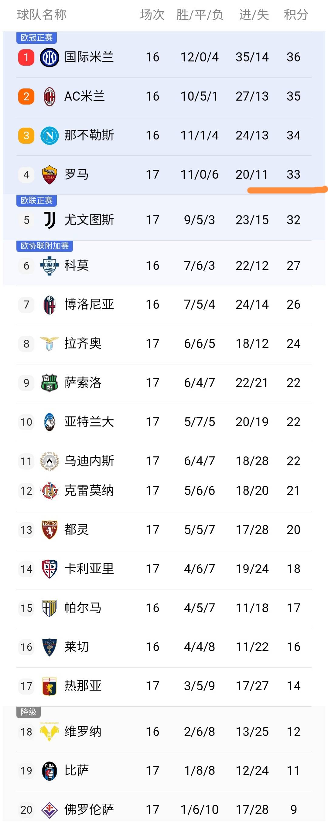 ในช่วงเช้าตรู่ของวันนี้ การแข่งขันนัดสุดท้ายของรอบที่ 17 ของเซเรียอาได้สิ้นสุดลง โดยโรม่าพบกับเจนัว หลังจากการแข่งขันนี้ สโมสรเซเรียอาทั้ง 20 ทีมได้เสร็จสิ้นการแข่งขันในรอบที่ 17 แล้ว มาดูตารางลีกและอันดับผู้ทำประตูสูงสุดที่อัปเดตหลังจากรอบการแข่งขันนี้กัน