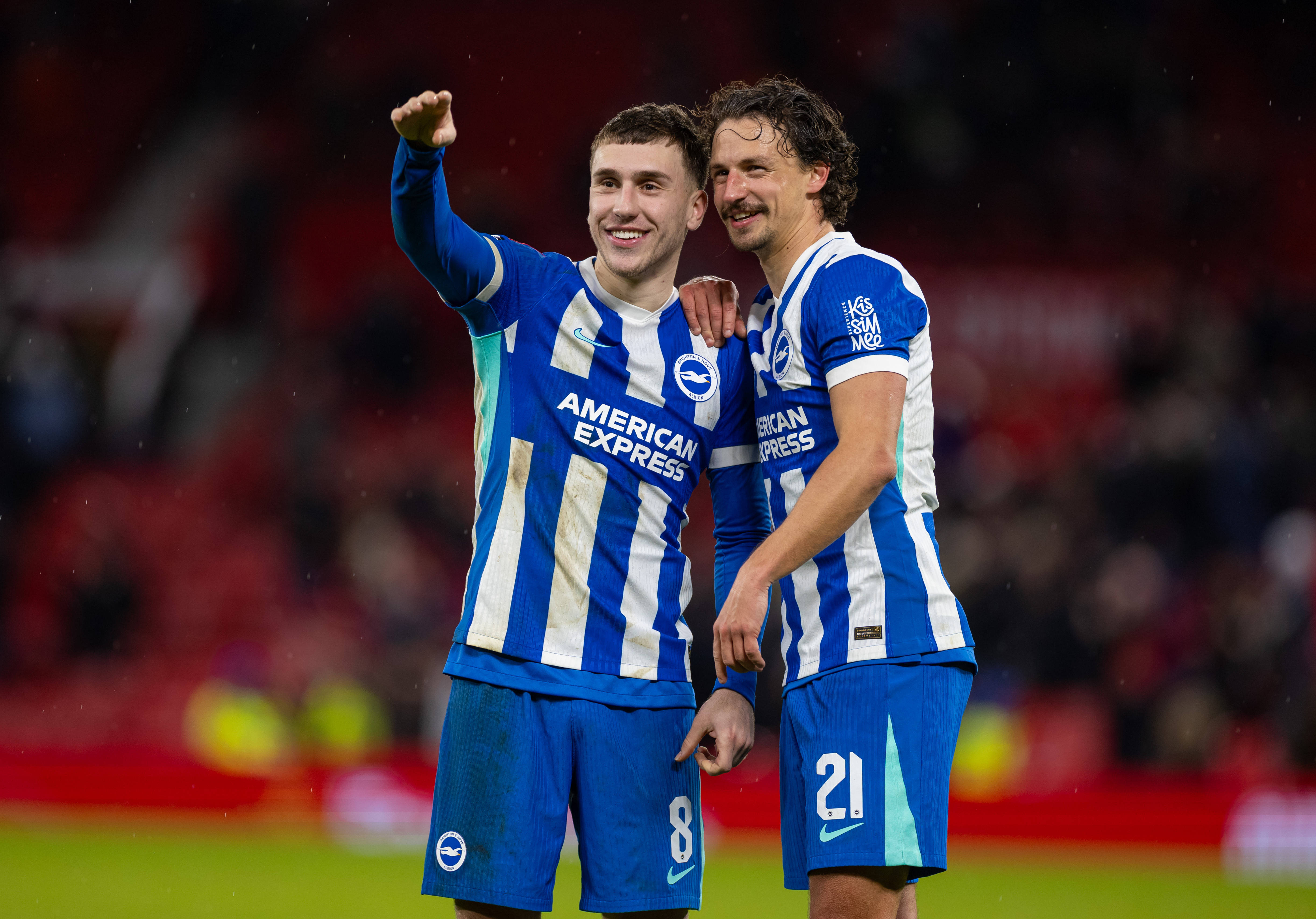 เมื่อวันที่ 11 มกราคม นักเตะของไบรตัน แอนด์ โฮฟ อัลเบี้ยน กรุดดา (ซ้าย) และโบสคาลี่ ฉลองหลังจบการแข่งขัน สำนักข่าวซินหัว