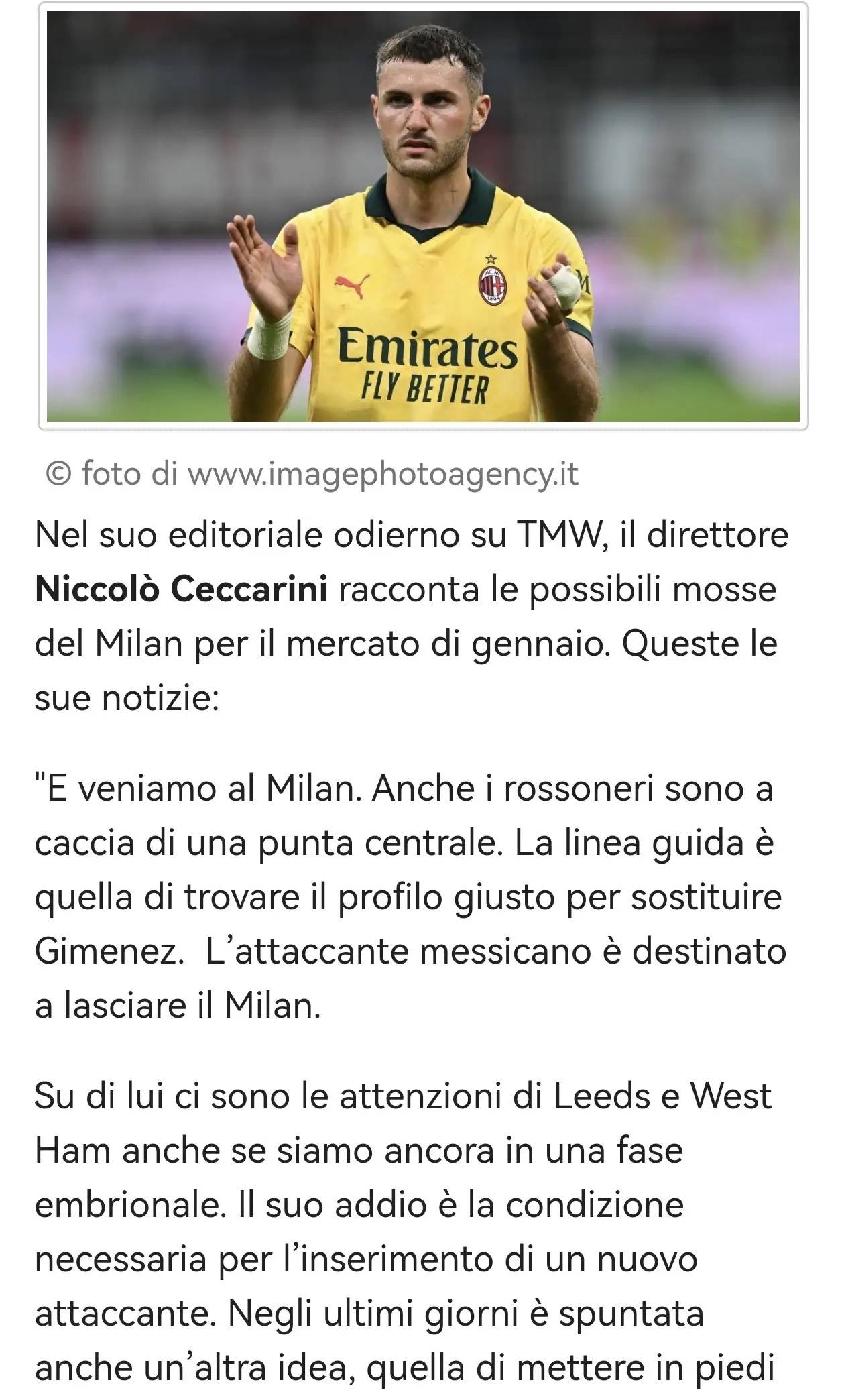 มาดูที่มิลานกันบ้าง ทีมรอสโซเนรีก็กำลังมองหาศูนย์หน้าตัวเป้าเช่นกัน โดยมีเป้าหมายหลักคือการหาตัวแทนที่เหมาะสมสำหรับจิเมเนซ กองหน้าชาวเม็กซิกันซึ่งมีแนวโน้มที่จะอำลาทีมมิลานอย่างแน่นอน