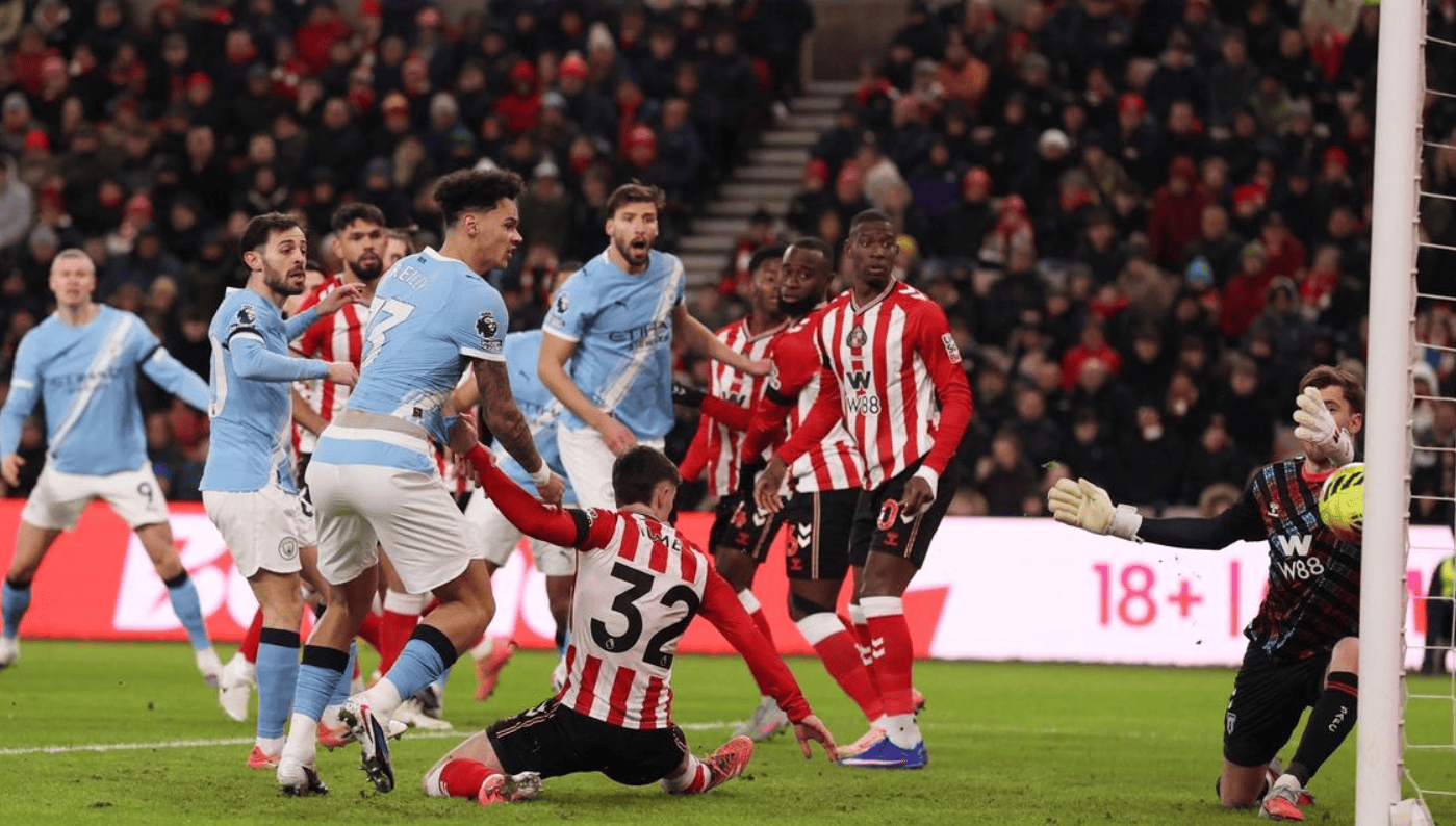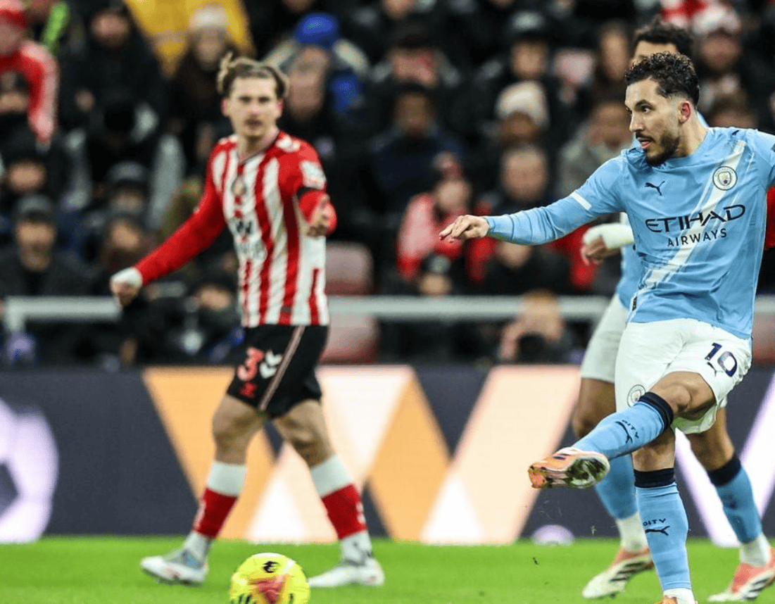 การแข่งขันพรีเมียร์ลีกนัดที่ 19 แมนเชสเตอร์ ซิตี้ เดินทางไปเยือนซันเดอร์แลนด์ที่เพิ่งเลื่อนชั้นขึ้นมาใหม่ ในครึ่งแรก เบอร์นาร์โด ซิลวา ทำประตูได้แต่ถูกจับล้ำหน้า, บอร์เรย์ พลาดโอกาสยิงประตูแบบตัวต่อตัว, ฮูม ยิงข้ามคานจากระยะใกล้ และฮาแลนด์ พลาดโอกาสทองหลังจากพักครึ่ง ซาวิโญ่พลาดโอกาสหลายครั้ง โดกุถูกสกัดกั้น และกวาร์ดิโอลยิงชนเสา สุดท้ายแมนเชสเตอร์ ซิตี้ เสมอกับซันเดอร์แลนด์ 0-0 ทำให้พวกเขาหยุดสถิติชนะติดต่อกัน 8 นัดในทุกการแข่งขัน