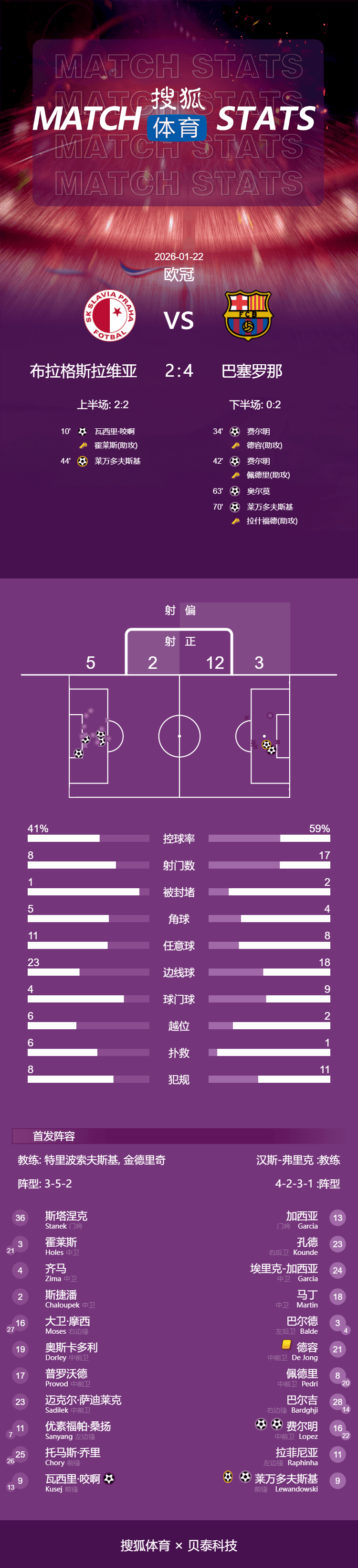 เวลา 04:00 น. ตามเวลาปักกิ่ง วันที่ 22 มกราคม บาร์เซโลนาเดินทางไปยังสลาเวีย ปราก เพื่อเผชิญหน้ากับสลาเวีย ปราก ในรอบที่เจ็ดของกลุ่มการแข่งขันยูฟ่าแชมเปียนส์ลีก ฤดูกาล 2025-26ครึ่งแรกเต็มไปด้วยการยิงประตูอย่างดุเดือด โดยเจ้าบ้านขึ้นนำก่อนจากลูกยิงของคูเซจ เฟร์มินยิงสองประตูให้บาร์เซโลนาขึ้นนำ แต่เลวานดอฟสกี้ทำเข้าประตูตัวเองโดยไม่ได้ตั้งใจ ทำให้ทั้งสองทีมเสมอกัน 2-2 ในช่วงพักครึ่ง หลังจากพักครึ่ง โอลโมทำประตูให้บาร์เซโลนาขึ้นนำอีกครั้ง และเลวานดอฟสกี้ก็ยิงประตูชัยให้ทีมคาตาลันส์พลิกกลับมาเอาชนะสลาเวีย ปราก 4-2