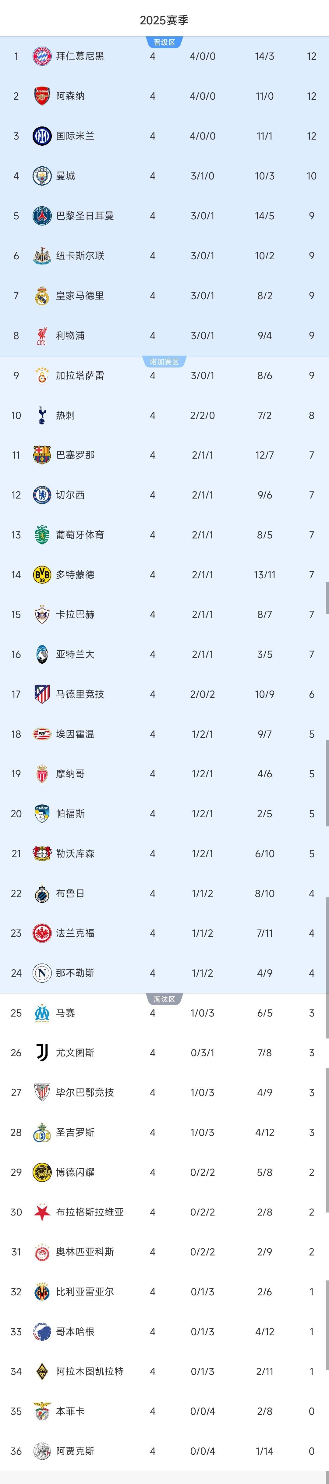 นอกจากนี้ บาร์เซโลนาประสบความพ่ายแพ้อย่างน่าตกใจด้วยผลเสมอ 3-3 และอันดับในแชมเปียนส์ลีกได้รับการอัปเดตแล้ว: แมนเชสเตอร์ ซิตี้ได้เลื่อนขึ้นมาอยู่อันดับที่สี่ ขณะที่อินเตอร์ มิลานซึ่งชนะติดต่อกันสี่นัด อยู่ในอันดับที่สามในขณะนี้