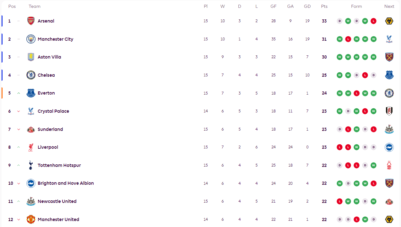 ตารางคะแนนพรีเมียร์ลีก: ซิตี้ตามหลังเดอะกันเนอร์สเพียงสองแต้ม; เชลซีตามหลังขณะที่เอฟเวอร์ตันพุ่งทะยานเหมือนจรวด_แอสตัน วิลล่า_ไบรท์ตัน_อาร์เซนอล