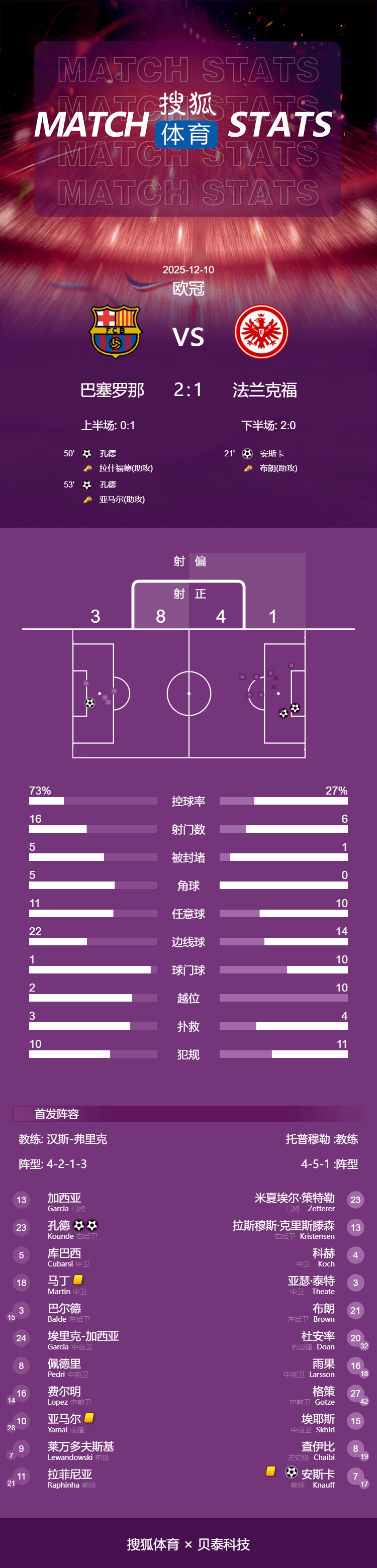 เวลา 04:00 น. ตามเวลาปักกิ่ง วันที่ 10 ธันวาคม บาร์เซโลนาเป็นเจ้าบ้านรับการมาเยือนของไอน์ทรัค แฟรงค์เฟิร์ต ในรอบที่ 6 ของกลุ่มการแข่งขันยูฟ่าแชมเปียนส์ลีก ฤดูกาล 2025-26ในครึ่งแรก ประตูของเลวานดอฟสกี้ถูกตัดสินว่าเป็นลูกล้ำหน้า ขณะที่นอยบ์เป็นผู้ทำประตูให้ไอน์ทรัค แฟร้งค์เฟิร์ตขึ้นนำ 1-0 ในช่วงพักครึ่ง ในครึ่งหลัง กุนเด้ทำสองประตูด้วยการโหม่งภายในสามนาที ทำให้บาร์เซโลนาขึ้นนำ สุดท้ายบาร์เซโลนาสามารถพลิกกลับมาชนะไอน์ทรัค แฟร้งค์เฟิร์ต 2-1 ทำให้พวกเขาชนะติดต่อกันในทุกรายการเป็นนัดที่สี่ ปัจจุบันบาร์เซโลนาอยู่อันดับที่ 14 มี 10 คะแนนจาก 6 นัด ยังตามหลังอันดับแปดอยู่สองคะแนน