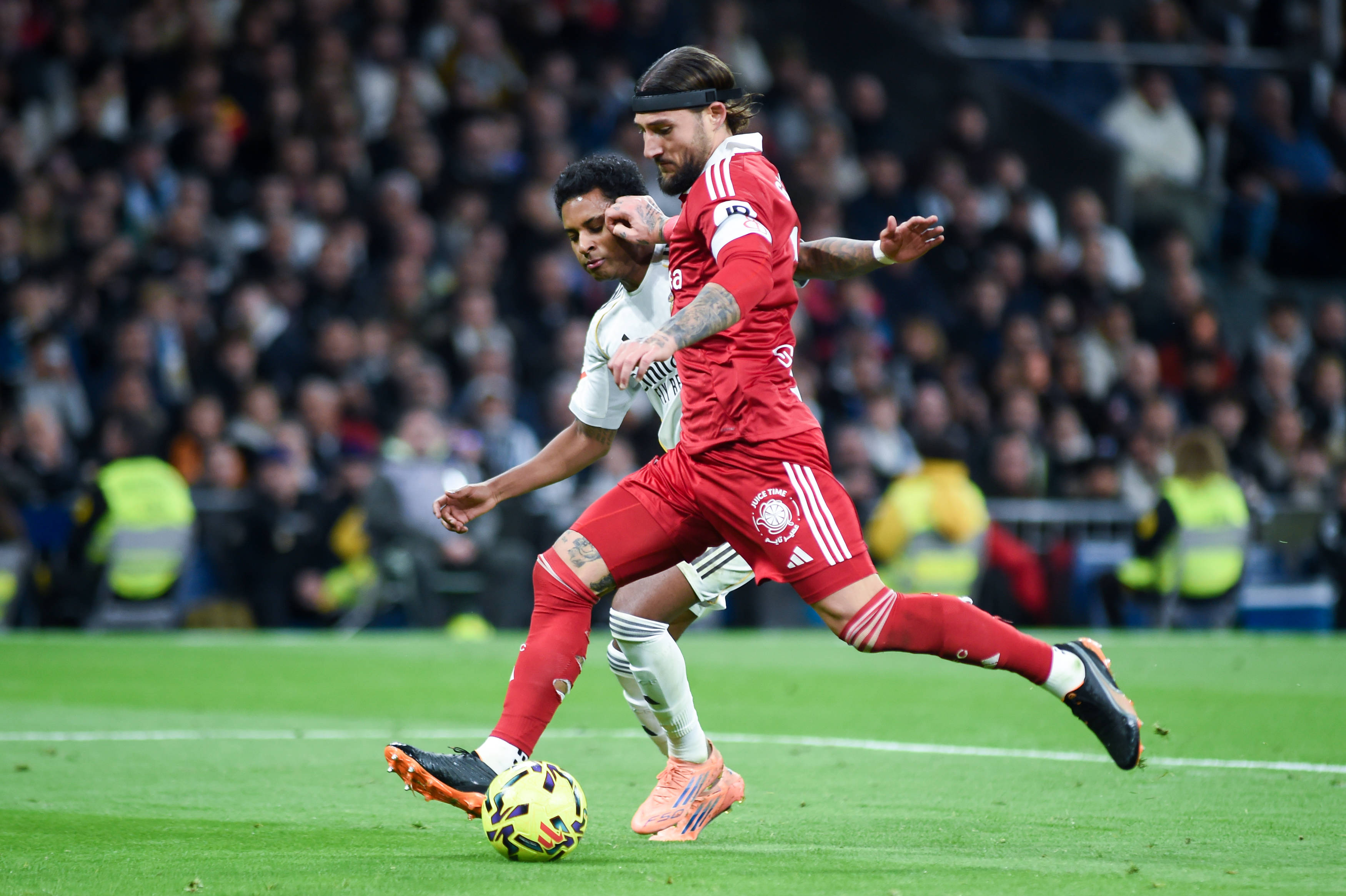 เมื่อวันที่ 20 ธันวาคม โรดรีโก้ (หลัง) ของเรอัล มาดริด และกูเดลจ์ ของเซบีย่า ต่อสู้เพื่อแย่งบอลในระหว่างการแข่งขัน สำนักข่าวซินหัว (ภาพโดย กุสตาโว บาร์เรียโตส)